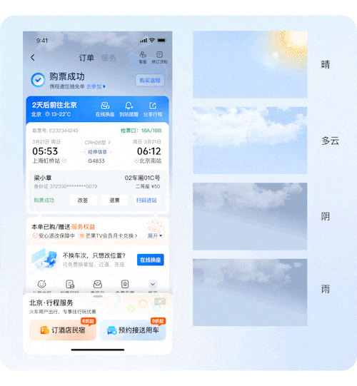 虽然改版始于解决核心体验问题和业务诉求,但我们也十分在产品的“温度感”。通过头部实时动态目的地天气动态氛围,帮助用户更加直观Get到达日目的地的天气状况,合理规划出行安排,从而打造有温度的出行体验。