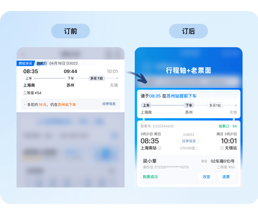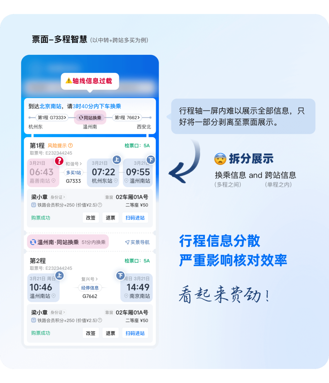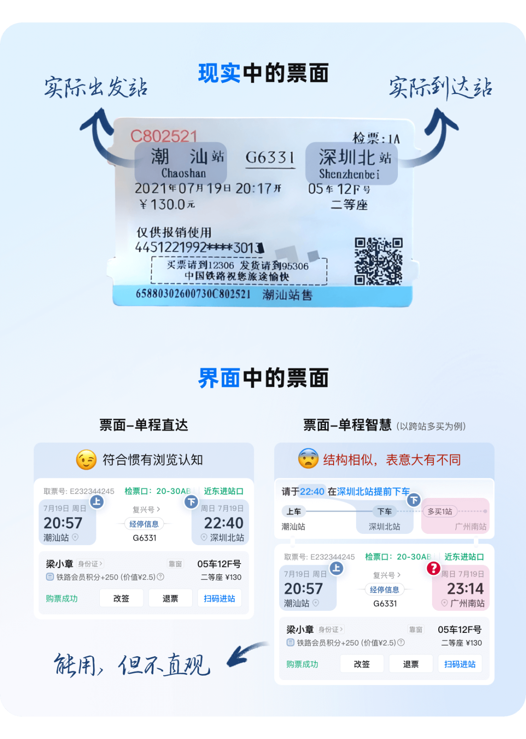 在智慧方案出现之前,票面信息直接对应实际的行程信息,上下车站点分布在票面的两端。智慧方案的出现打破了这种一贯以来的认知心智,对于多买或者补票方案来说,票面左侧的站点不一定是实际上车点,票面右侧的站点也不一定是实际下车点,用户需要来回在轴与票之间来回浏览理解,此时的行程信息能用,但不直观。
