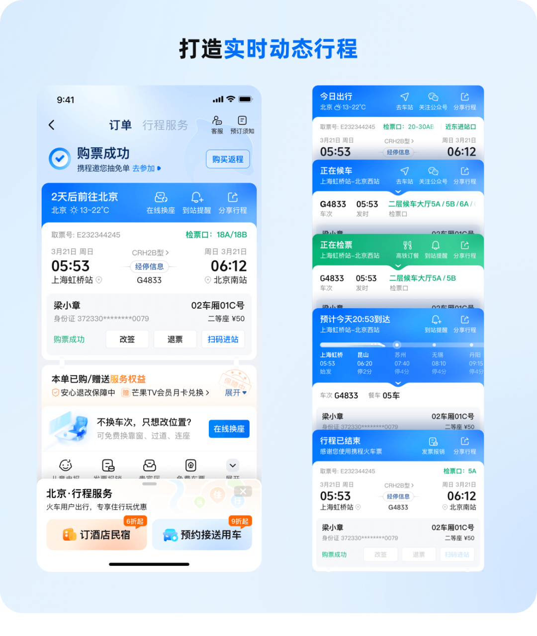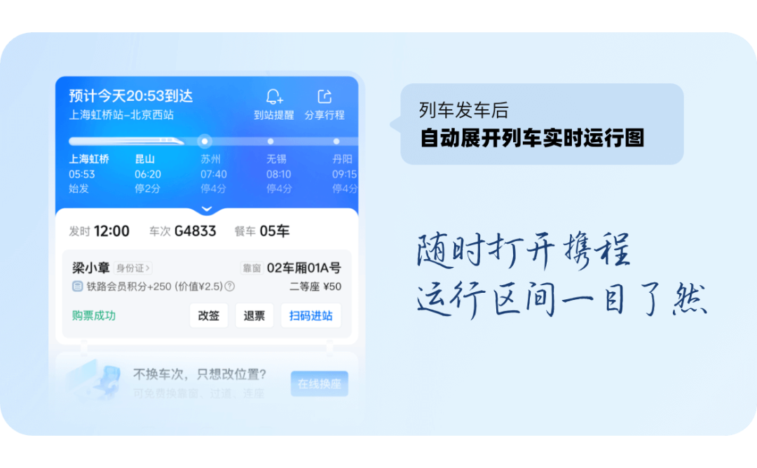 在检测到用户顺利通过进站闸机并发车后,票面信息会进一步简化降噪,取而代之的是用户在行中更为关注的列车实时运行进度,进一步提升体验。