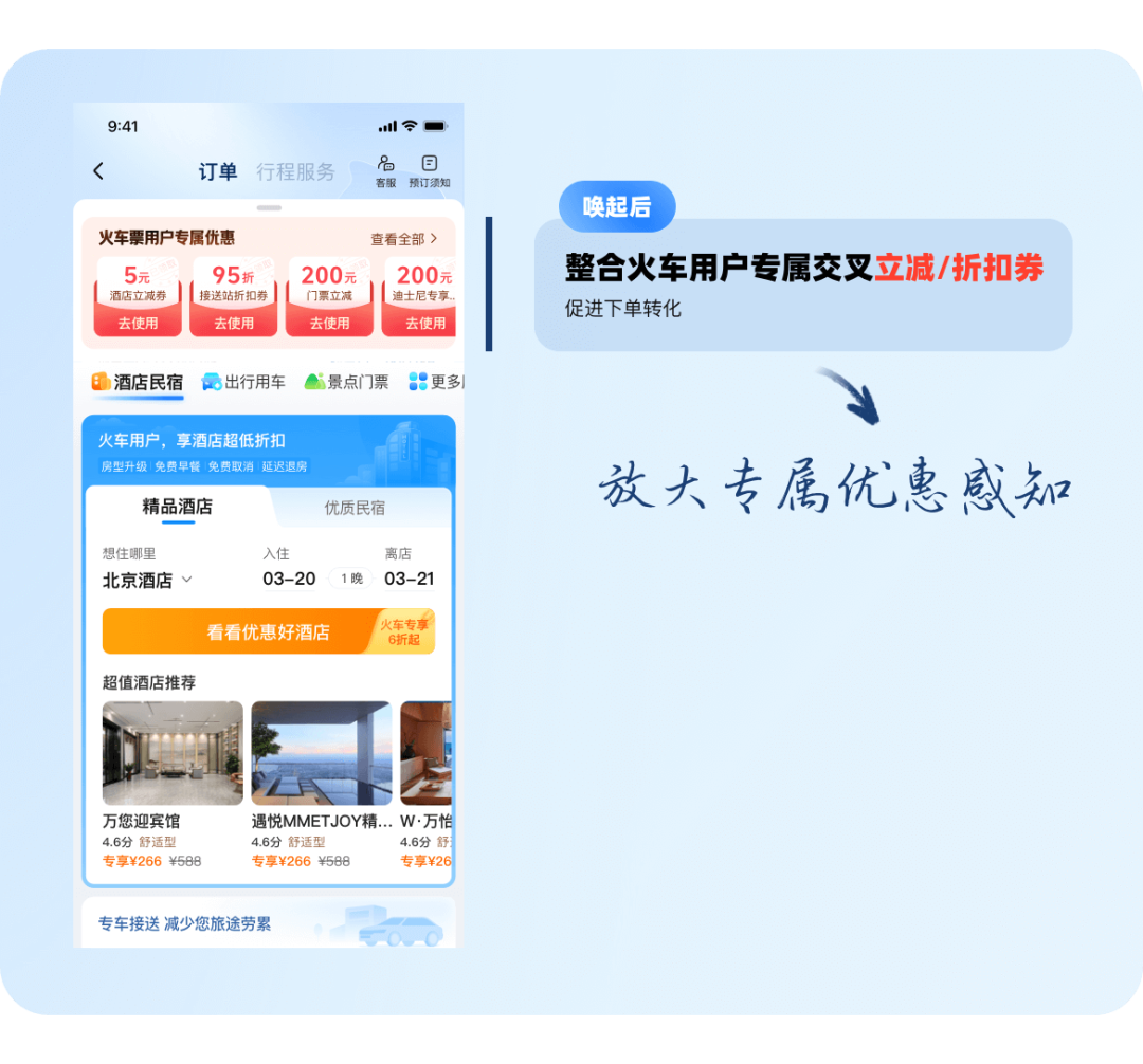 唤起后,自然不能浪费用户宝贵的探索欲,通过整合已有的交叉优惠和折扣信息,放大火车用户有专属优惠的感知,为交叉预订转化增添动力。