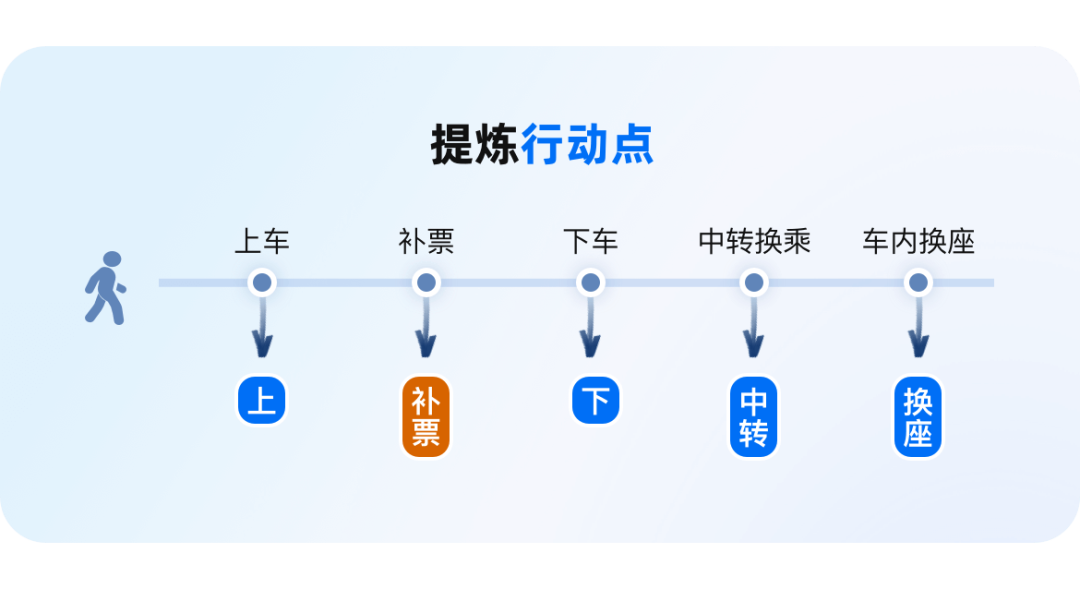 在后续的方案尝试中,我们首先将多类智慧行程中,存在共性的行程行动点进行提炼。(对于这些行动点的定义为:物理世界中需要乘客进行响应的行为)