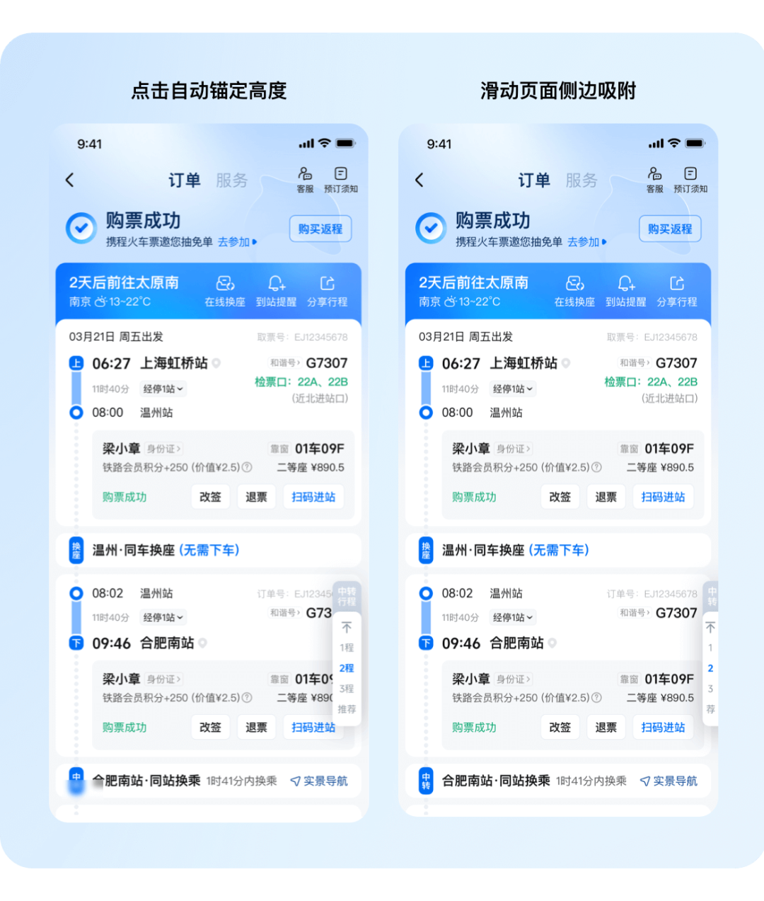 除此之外,火车票设计团队正在进一步挖掘更多能够带给用户出行关怀的差异化设计,比如:旅游路线行中沿途景点展示、中转换乘、同车换座动态可视化指引、多进站口高铁站最优路线规划...敬请期待🤗