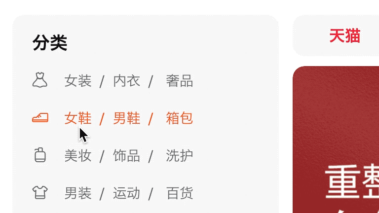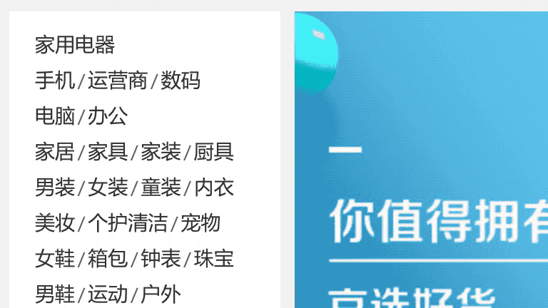 乍看之下,是不是感觉很像京东的那个导航?但是你仔细看我的鼠标动作,会发现虽然大部分一级导航悬停时会出现二级导航,但有几个却没有二级导航(如家具和女装那两行)。