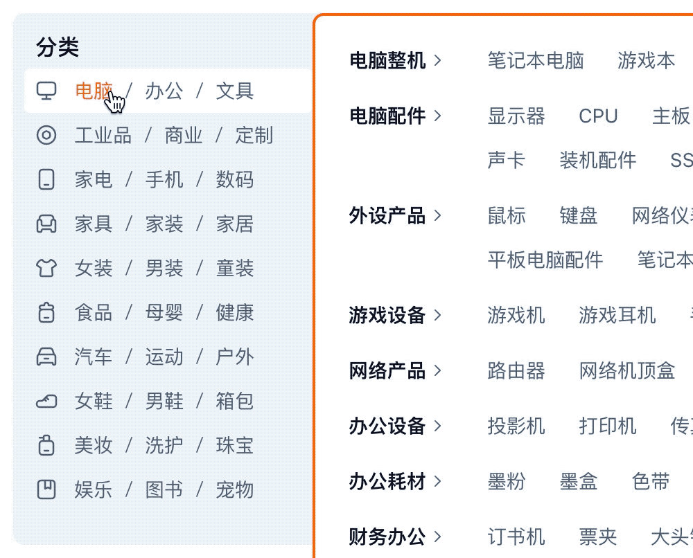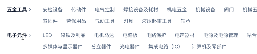 另外,淘宝新二级导航上最左侧的一列文字(如下图的“电子元件”),是不是让人以为能点击跳转?其实不能。