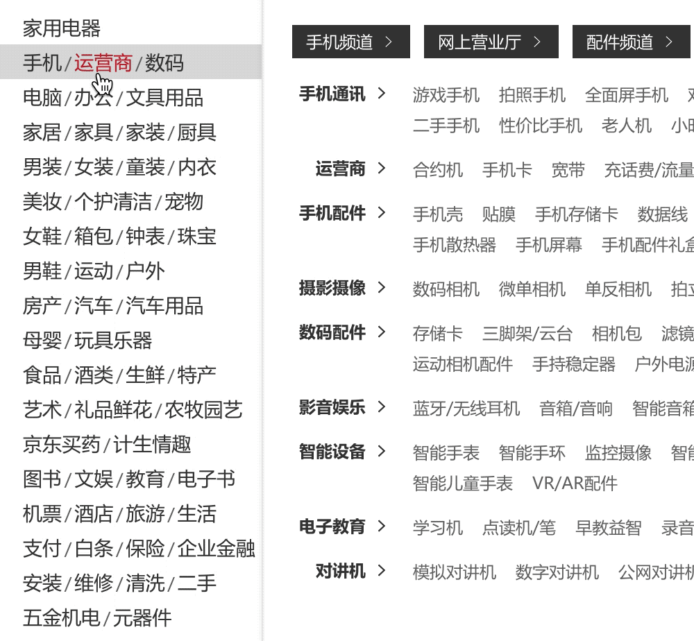 下图是京东现在的导航,和去年差不多,所有的一级导航都能悬停看到二级导航,非常统一: