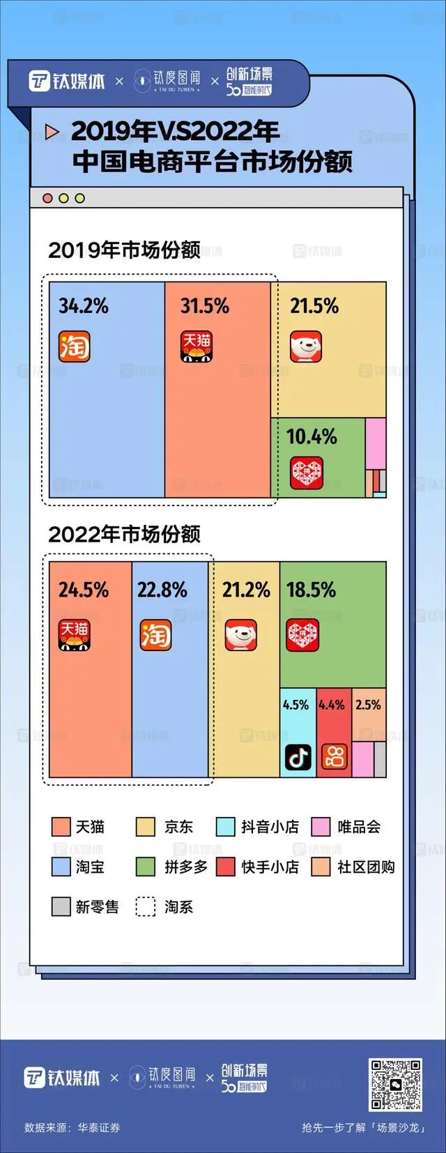 以淘宝和天猫为主的淘系电商平台,市场份额在2022年达到47.3%。这个数字看着不低,但比起2019年已经下滑了18.4%。这损失的市场份额,主要是被拼多多抢走了。