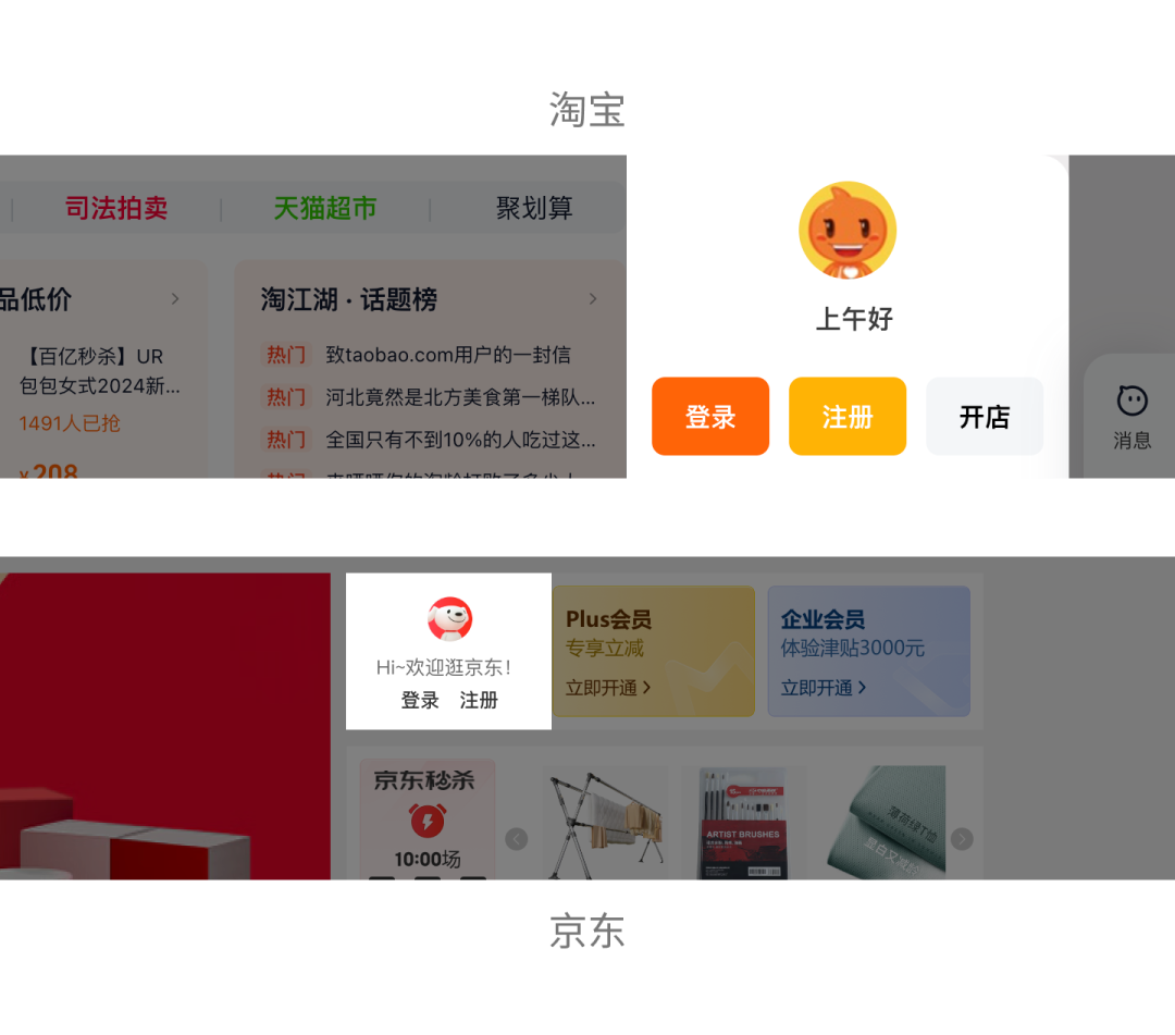 第3点:淘宝的登录按钮很显眼;京东的登录模块太小了,不好找。