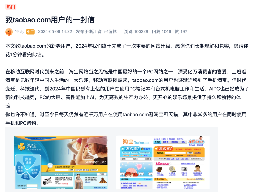 好巧不巧,前不久淘宝官方就在自家论坛「淘江湖」发布帖子说:“决心重新启动taobao.com优化工作。”