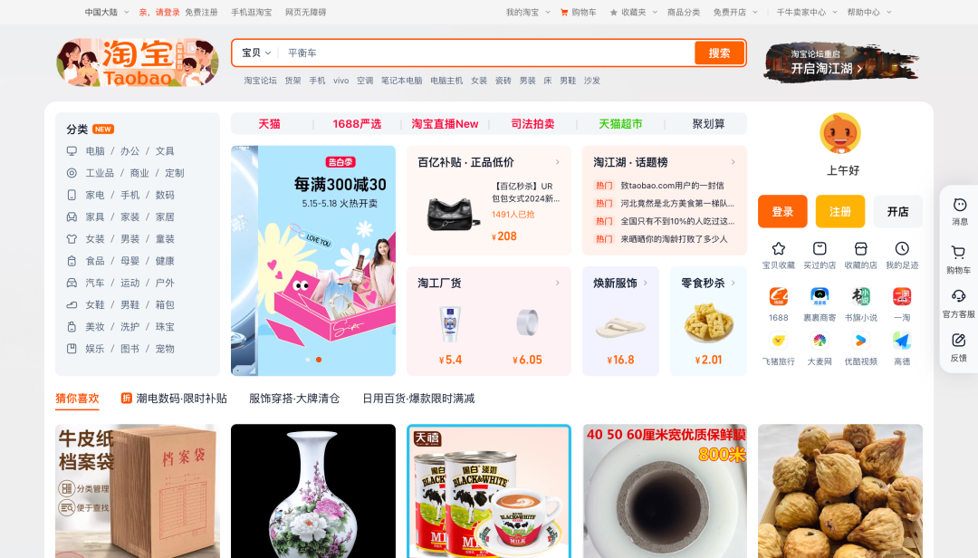 淘宝的首页设计明显更加简陋,顶部没什么商品推荐,下面的内容列表的居然还是「猜你喜欢」。要知道,这里还没登录,天知道这些商品是根据什么来猜的?