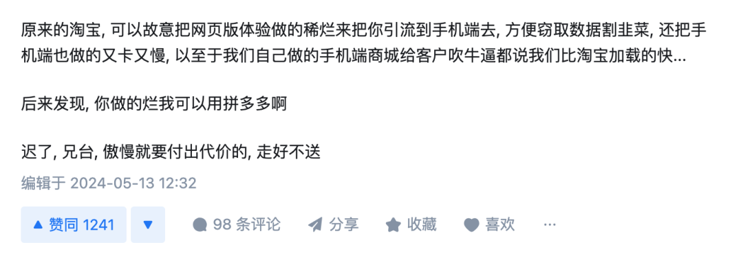 然而,淘宝之前却一直在PC端摆烂,明明能力做好,结果还不如被业内视为二线大厂的京东。