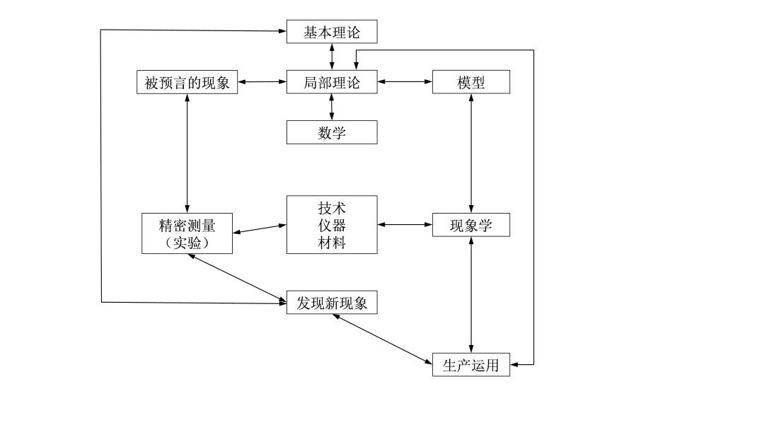 如果我们把这个体系看成是一个活的有机体,每个方框代表这个有机体的一个“器官”,想象一下这个有机体的生存和发展,还是很有趣的。在这个体系中,各个不同部分互相依存,它们代表着很复杂的相互作用系统,并随着时间而进化。如果切除某个“器官”,这个有机体就难以存活下去。对这种比喻性的理解,有助于我们看清物理学的基本研究思路体系的本来面目并加以重视。在理论方面,你也许会想起牛顿、麦克斯韦、爱因斯坦,在实验方面,你也许会想起伽利略、法拉第、卢瑟福,在数学方面,你也许会想起欧几里得、黎曼、希尔伯特。无论你从哪个“器官”想起谁,都会感受到这些科学家们在源源不断地通过这些“器官”向这个有机体输运营养,也许未来的你也是其中的一个。