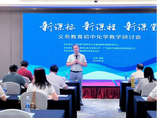 为深入贯彻落实教育部《义务教育课程方案(2022年版)》及《义务教育化学课程标准(2022年版)》新理念新要求,加强教师对新课标新教材的理解和把握,推动义务教育化学课堂教学改革,2024年5月6日—9日,由教育部华南师范大学基础教育课程研究中心主办,广东教育出版社有限公司、广东南方传媒教育发展有限公司承办的“新课标 新课程 新课堂”初中化学教学研讨会在江西省南昌市召开。此次会议汇聚了化学教育领域的专家、教研员及骨干教师,共同探讨初中化学新课标的理论落地和新教材的教学实施。