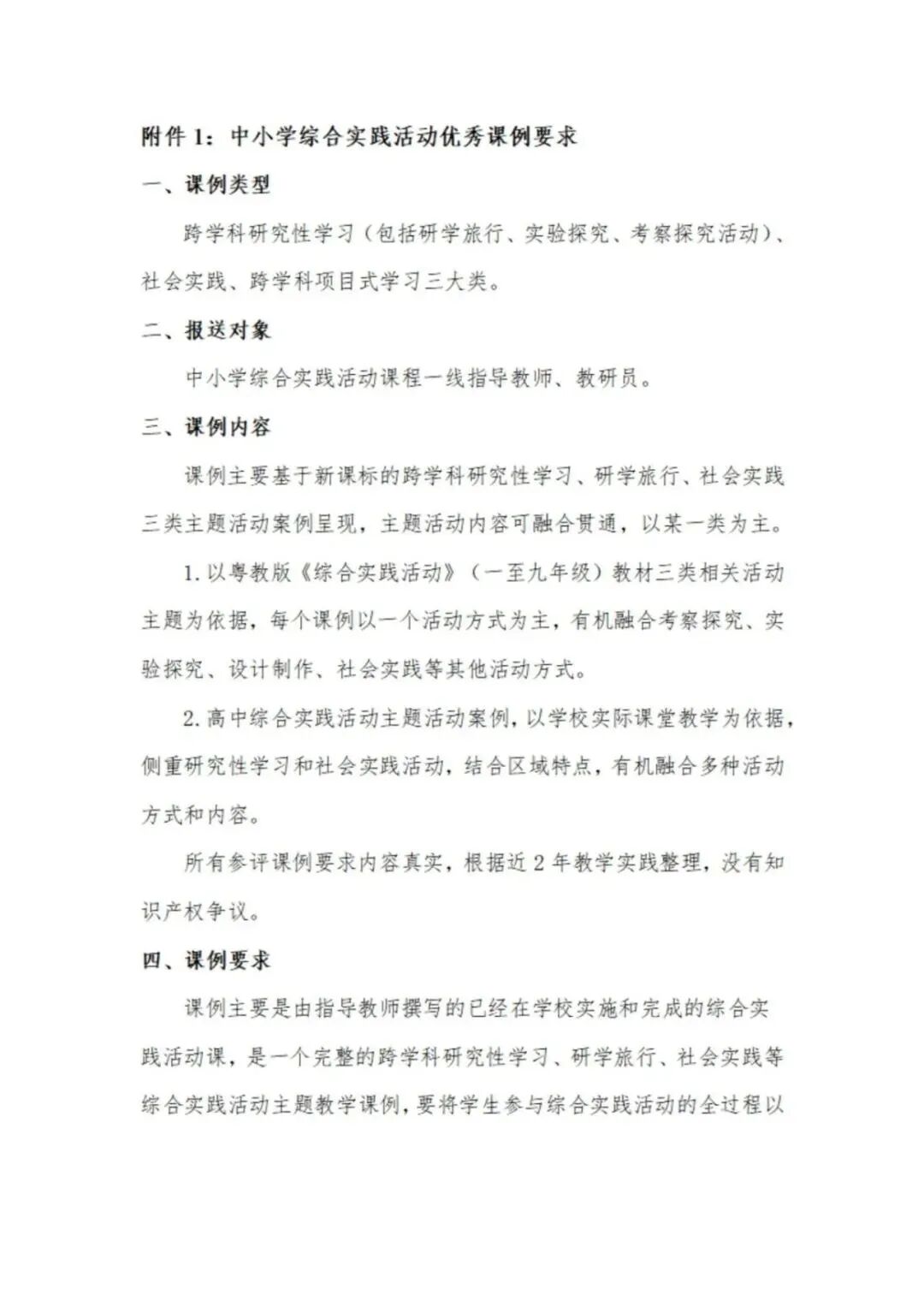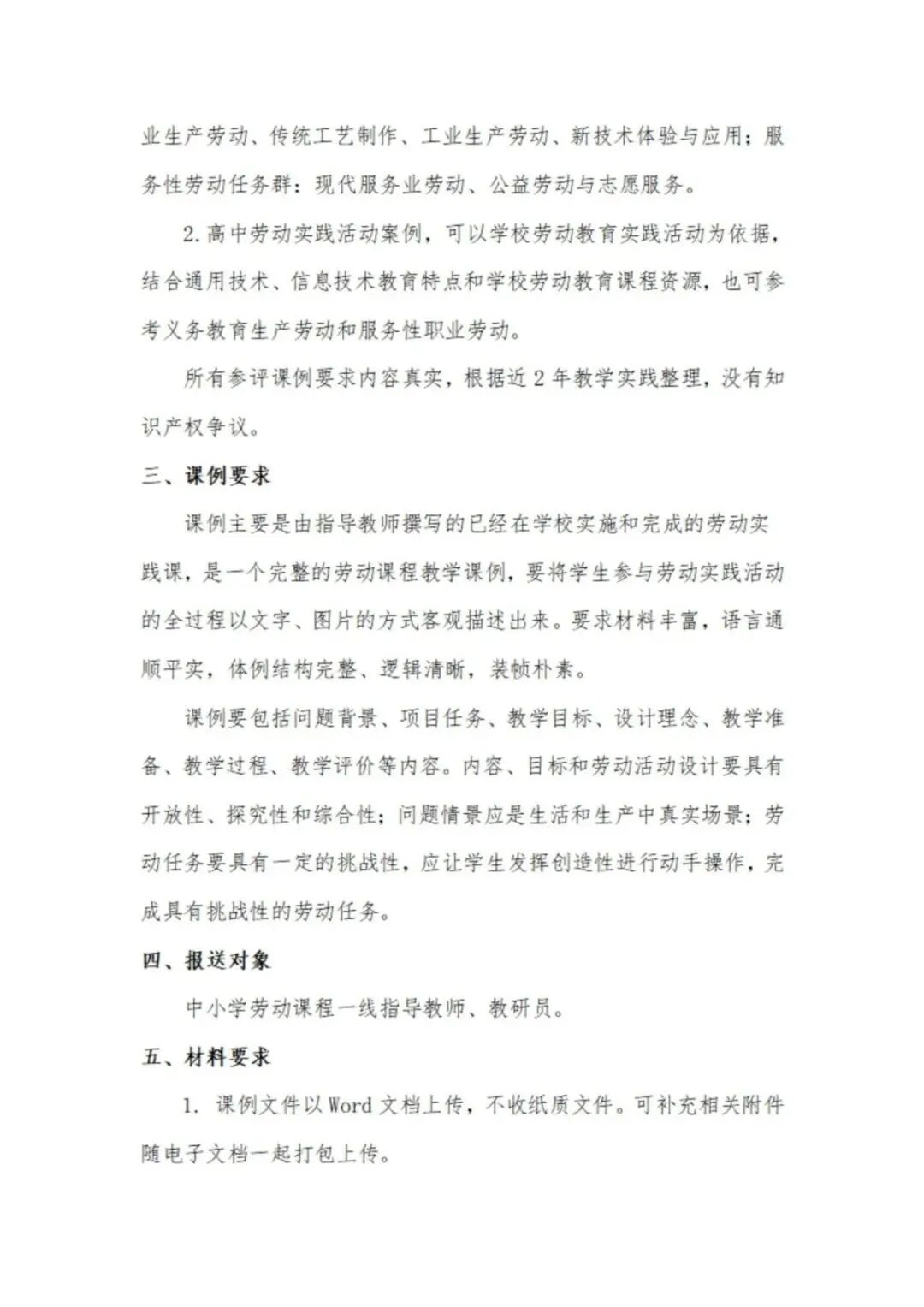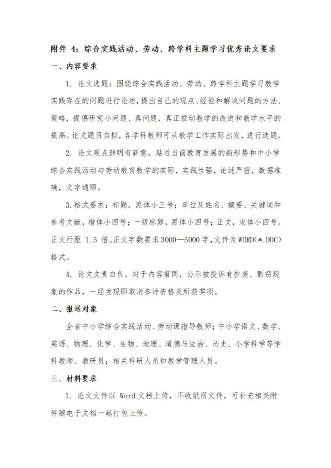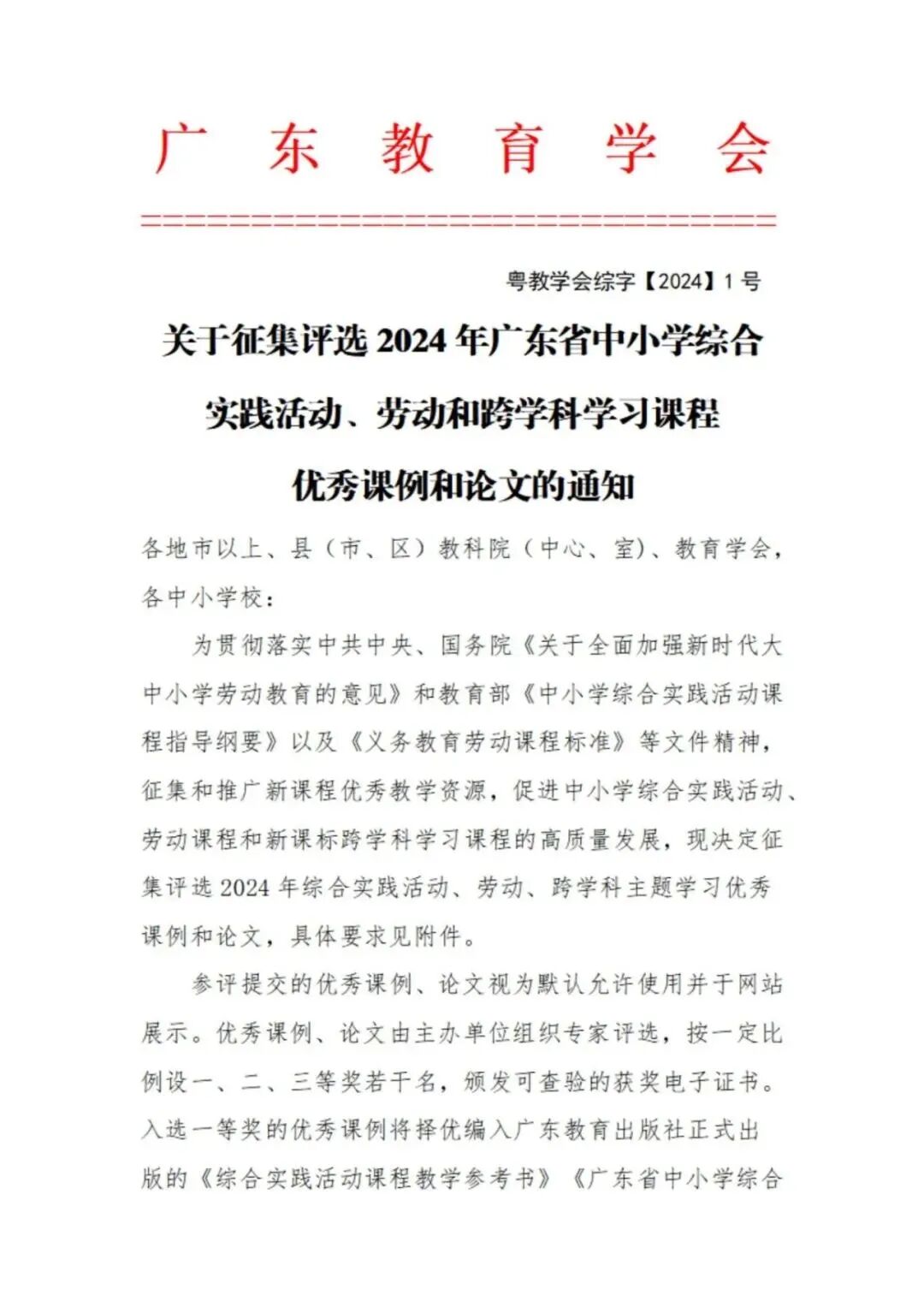 为贯彻落实中共中央、国务院《关于全面加强新时代大中小学劳动教育的意见》和教育部《中小学综合实践活动课程指导纲要》以及《义务教育劳动课程标准》等文件精神,征集和推广新课程优秀教学资源,促进中小学综合实践活动、劳动课程和新课标跨学科学习课程的高质量发展,现决定征集评选2024年综合实践活动、劳动、跨学科主题学习优秀课例和论文,具体要求见附件。