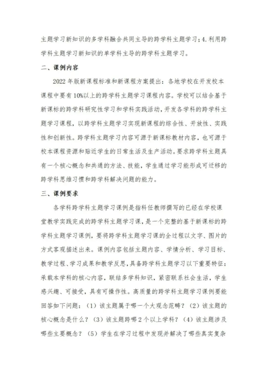 2022年版新课程标准和新课程方案提出:各地学校在开发校本课程中要有10%以上的跨学科主题学习课程内容。学校可以结合基于新课标的跨学科研究性学习和学科实践活动,开发各学科的跨学科主题学习课程,以跨学科主题学习实现新课程的综合性、开放性、实践性和创新性。跨学科主题学习内容可源于新课标教材内容,也可源于校本课程资源和贴近学生的日常生活及生产活动。要求跨学科主题具有一个核心概念和共通的方法、技能,学生通过学习能形成可迁移的跨学科思维习惯和跨学科解决问题的能力。