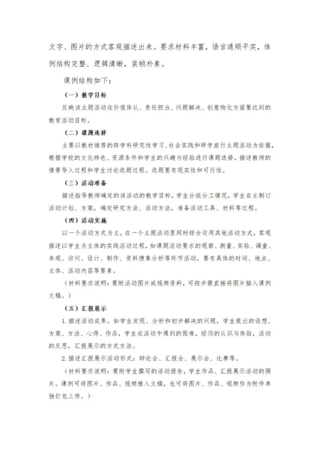 课例主要是由指导教师撰写的已经在学校实施和完成的综合实践活动课,是一个完整的跨学科研究性学习、研学旅行、社会实践等综合实践活动主题教学课例,要将学生参与综合实践活动的全过程以文字、图片的方式客观描述出来。要求材料丰富,语言通顺平实,体例结构完整、逻辑清晰,装帧朴素。