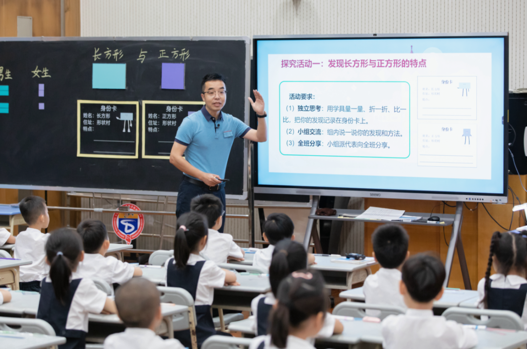 第二个环节是课例展示。第一节是王宏伟老师展示的二年级《长方形与正方形》。他创编了《长方形与正方形的奇妙之旅》数学故事,巧妙地以大情境故事引出探究性问题,将故事情境与探索长方形与正方形的特征、比较长方形与正方形的异同点、创造长方形与正方形等数学内容相融合,智趣相融,赏心悦目,很好地激发了学生对研究图形的好奇心,产生了良好的教学效果。