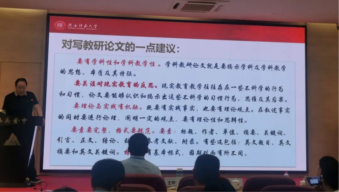 最后,王教授给出教研与教研论文写作的认识及建议。王教授认为,教研是对教育教学的深度研究,撰写教研论文就是“用自己的笔写出自己对教育教学理论与实践的研究、思考、认识、体会和情感”。王教授还指出“做好教研工作是撰写教研论文的基础”,要写好教研论文至少要做好“内容”和“表达”这两件事。鼓励大家努力提高对教育、教学本真的认识,提高对知识和文化本质的认识,鼓励大家坚持独立思考和学习研究,将教育、教学实践成果进行积累和凝练,形成自己的思想认识体系,突破教研论文写作的难点。