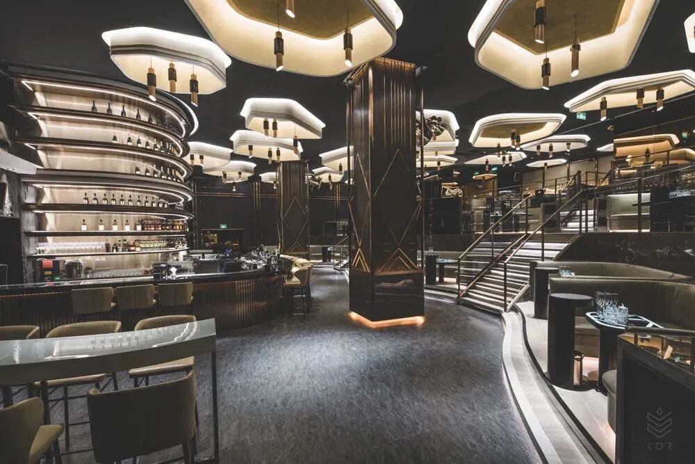 资料显示,KOR Shanghai号称亚洲首家Super Lounge,位于静安区南京西路1717号会德丰国际广场南院2楼,门店面积1000余㎡,集餐厅、酒吧、酒廊、Club于一身,经营模式是“日餐夜酒”,门店装修也是高级的黑金主调。配置方面,有米其林星级料理、世界级调酒工艺,还有全球最前卫的音响系统,其剧场式的室内设计更是赢得了德国iF大奖。