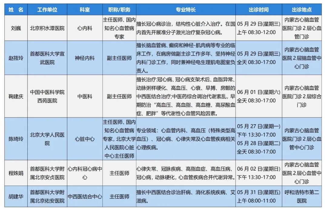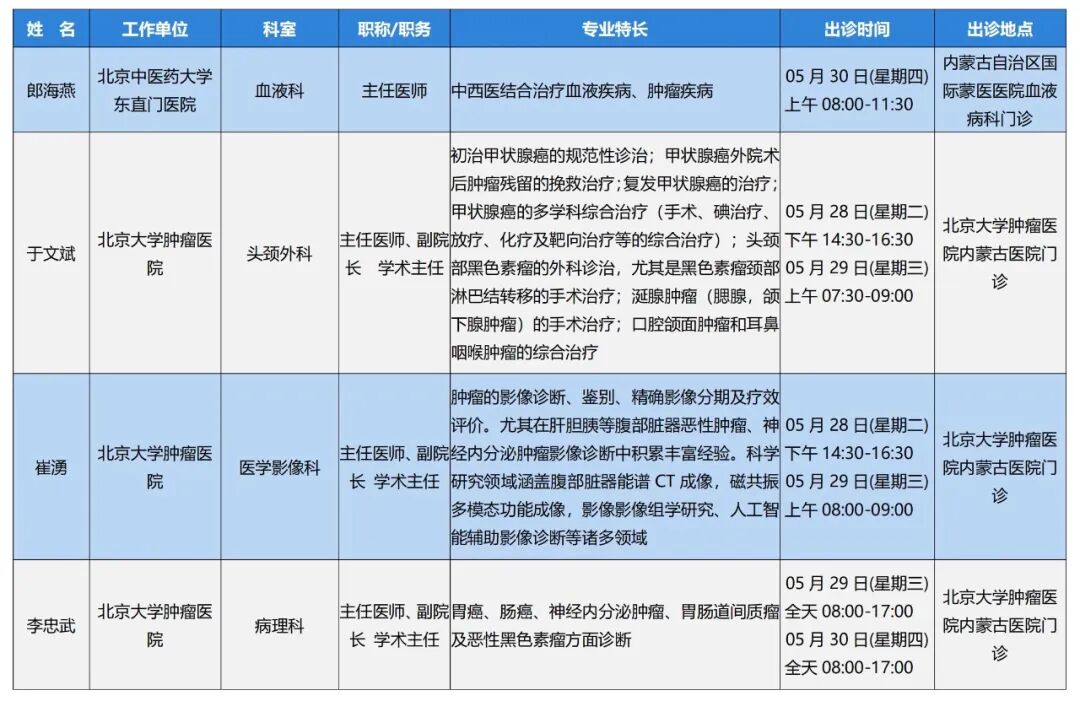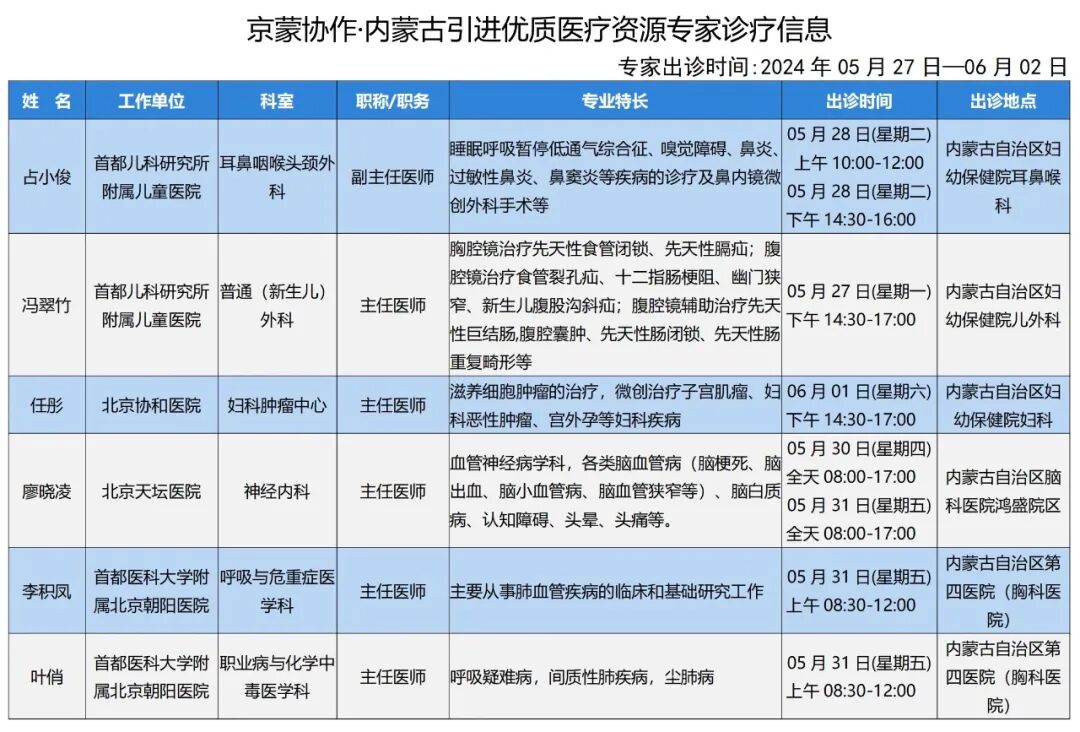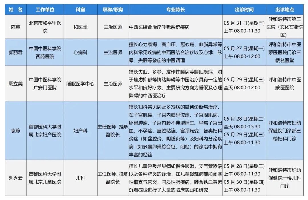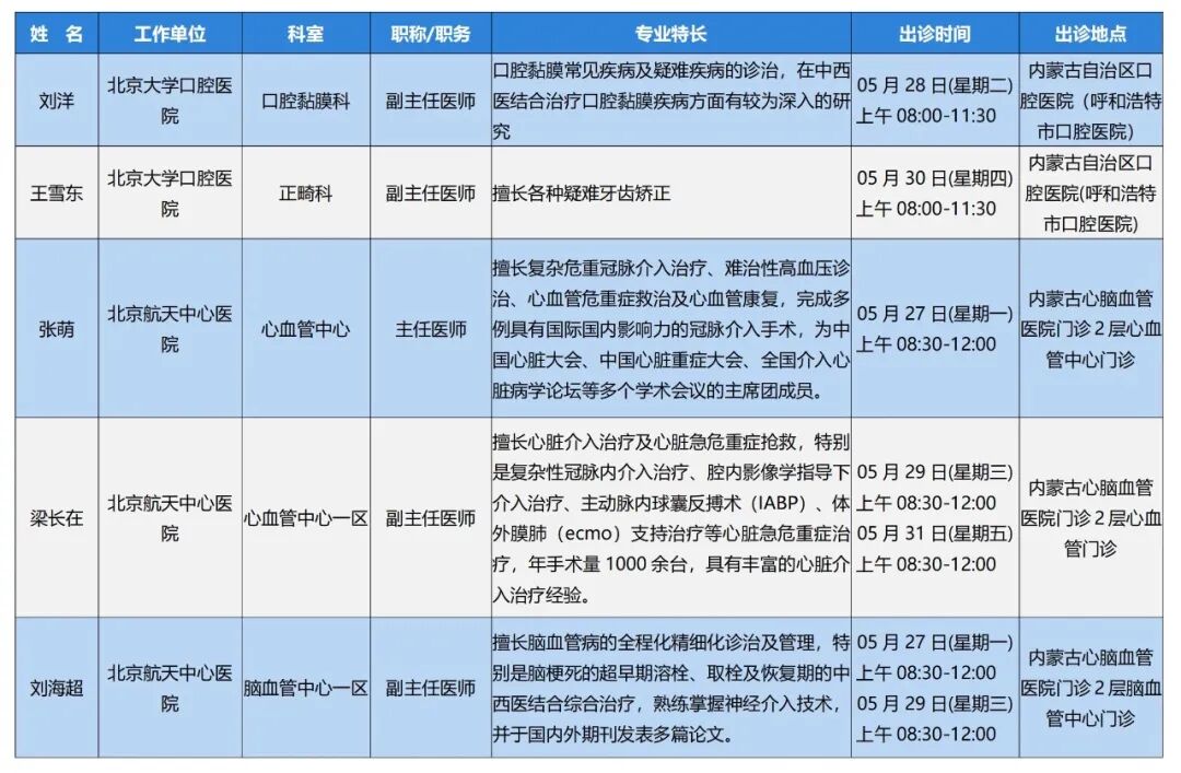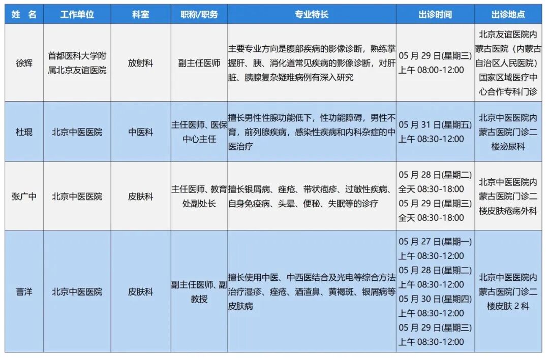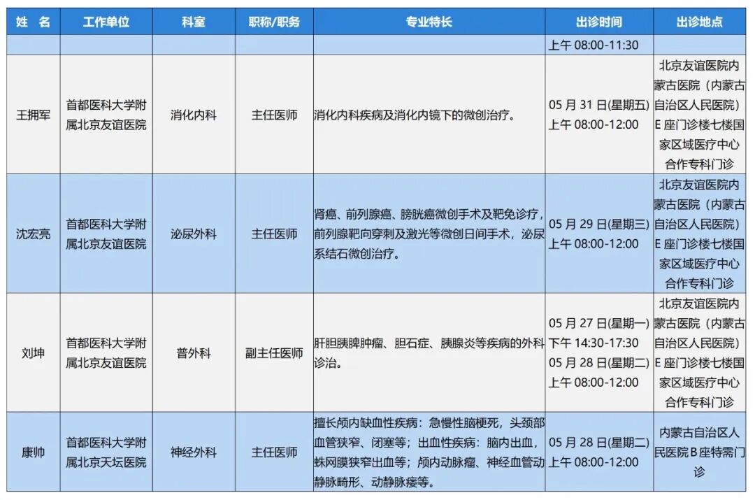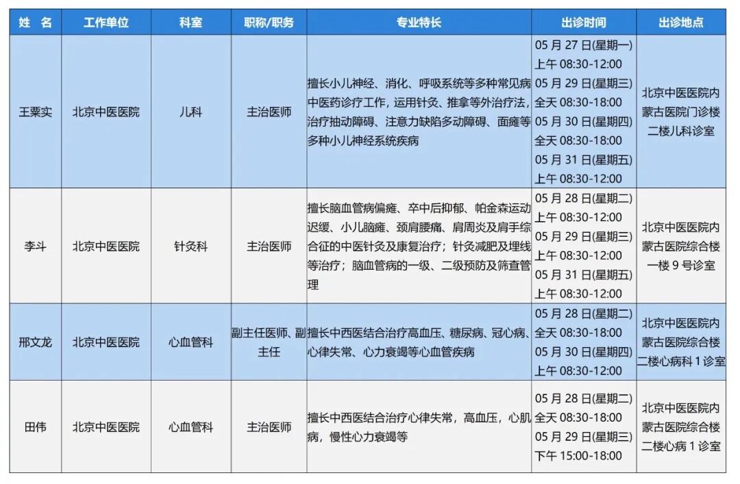【“京蒙协作”|本周北京协作医院专家出诊安排】