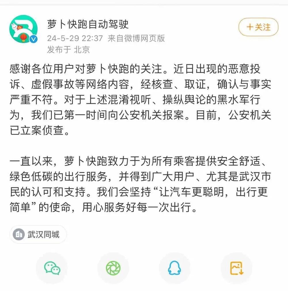 据新浪科技5月29日晚间消息,对于近日武汉城市留言板上出现多条关于萝卜快跑堵车投诉的内容,萝卜快跑今日回应表示,“近日出现的恶意投诉、虚假事故等网络内容,经核查、取证,确认与事实严重不符。对于上述混淆视听、操纵舆论的黑水军行为,我们已第一时间向公安机关报案。目前,公安机关已立案侦查。”