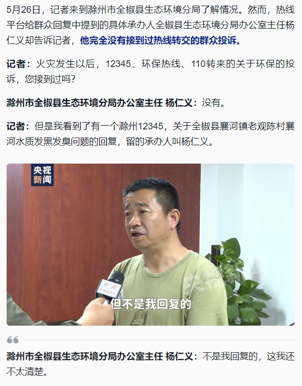 全椒县生态环境分局办公室原主任杨仁义在受访时采取“打死不承认”、全部否认的应对策略,伤害的却是该局的公信力,给人一种敷衍塞责的印象。其实,杨主任对于这种承办人署名为他的群众投诉,正确的方式是自己先去逐一了解,了解清楚之后再给记者予以答复,而不是“没有”“完全不知道”等。
