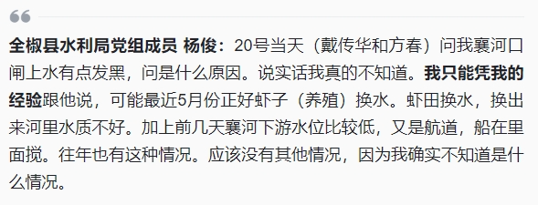 如果说“拿茅台比污水”是走了不负责任的极端,那么也要当心落入另一个极端——只对自己的言谈举止和公众形象“负责任”,却不对实际情况履职尽责。采访视频中,水利局原党组成员杨俊表示自己还有两个月退休,不该过问此事,隐有“明哲保身”“摘清责任”之意。生态环境分局办公室原主任杨仁义则是“打死不承认”,表示“凭经验、没有、完全不知道”,令人失望。