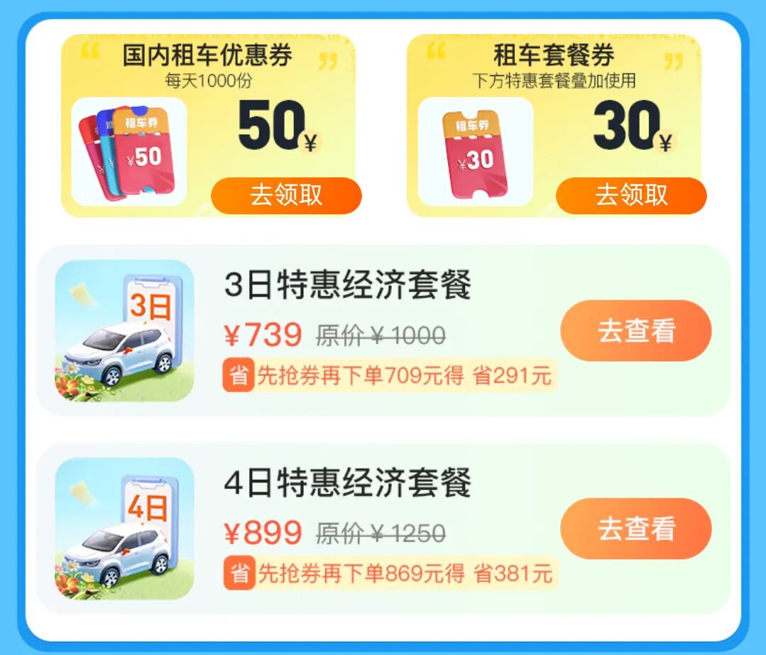 多项租车优惠券、套餐券免费送!