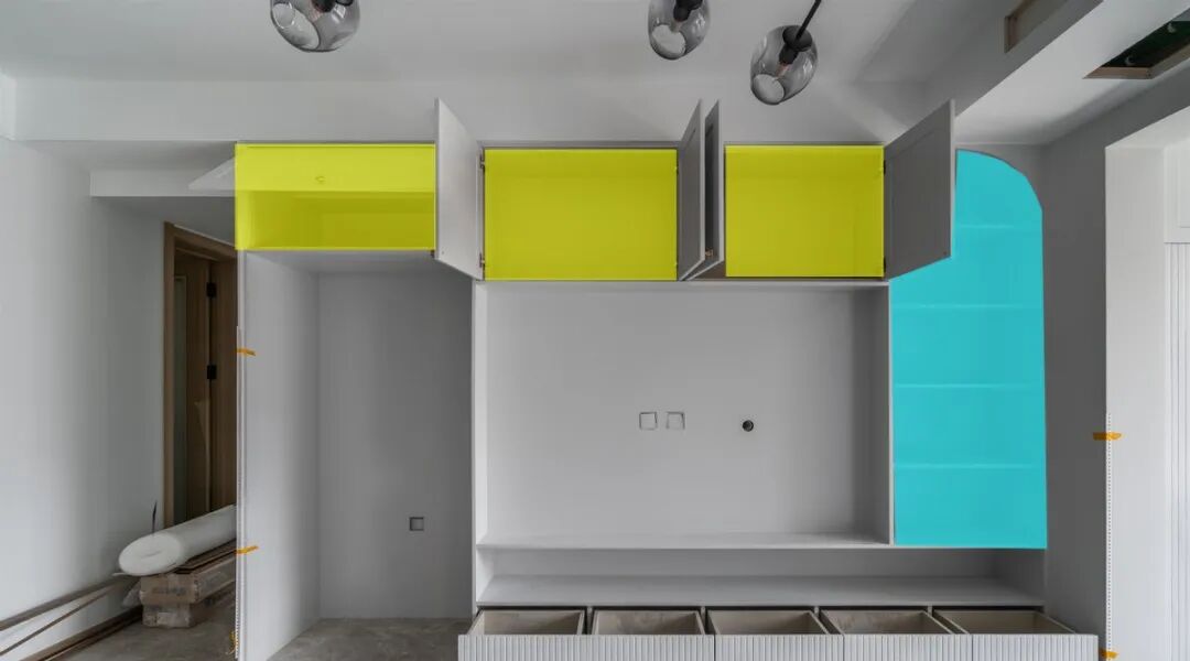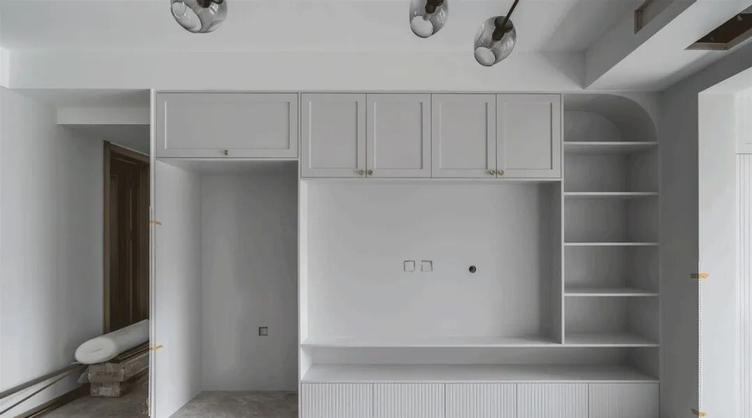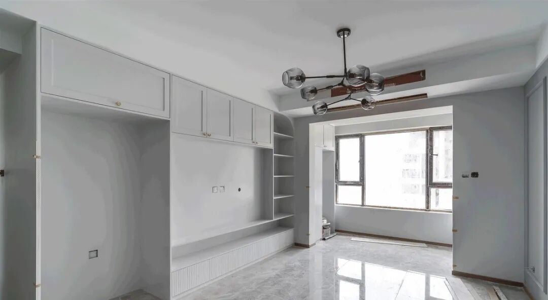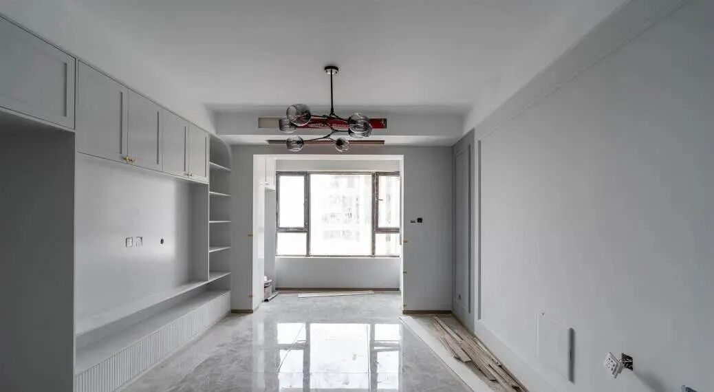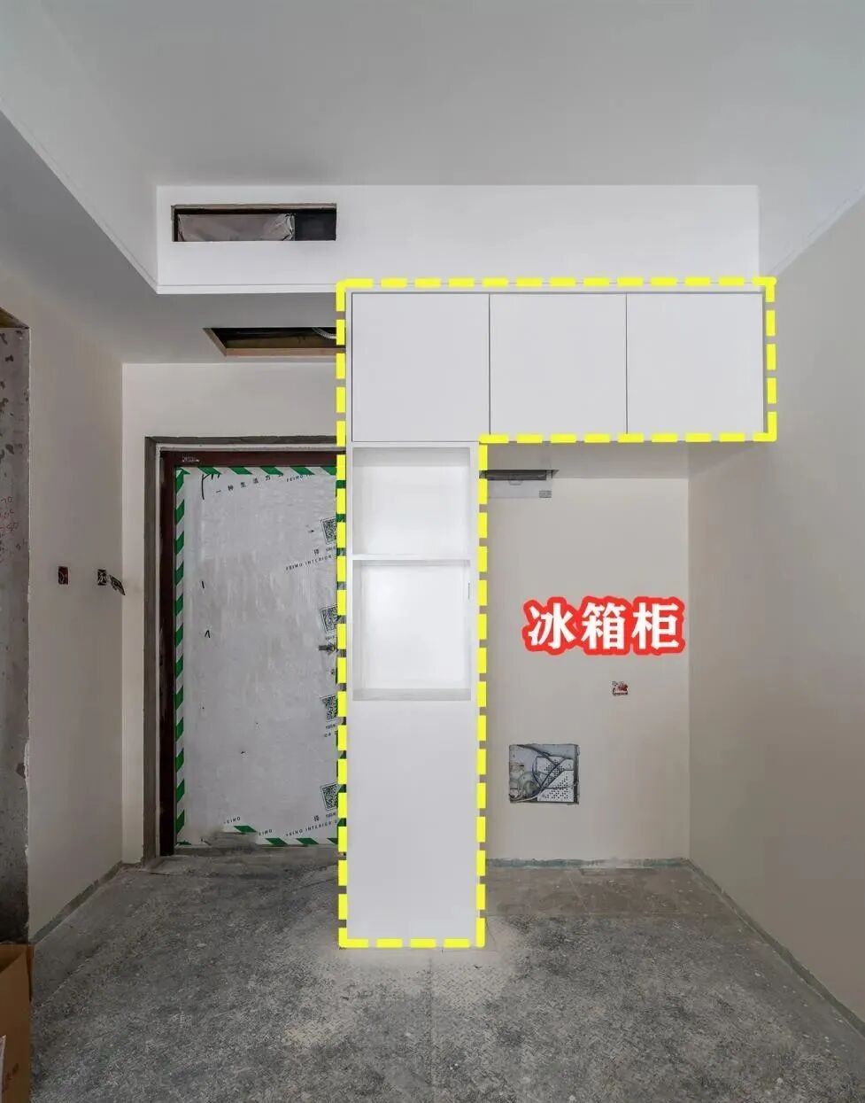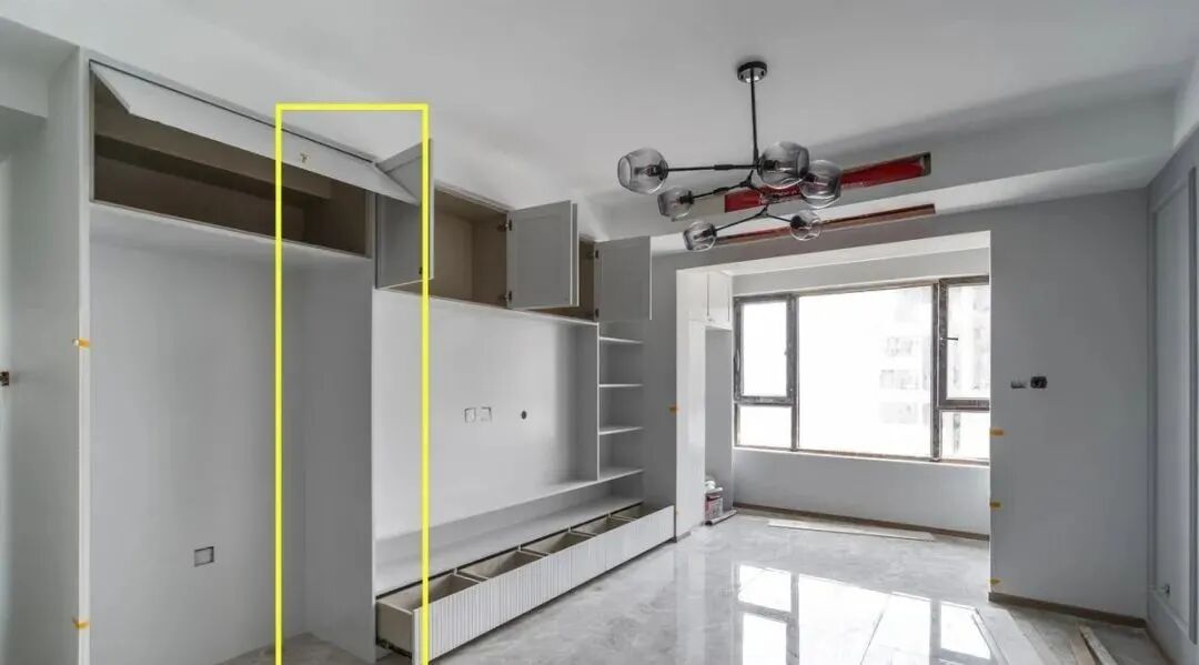 最中间的空间留给电视,壁挂上墙,一点不占面积,等后期软装沙发和冰箱等全进场之后,功能性齐全的高颜值客厅就实现了。