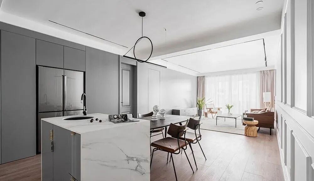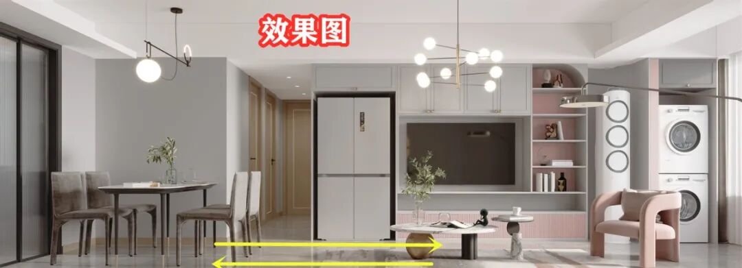 开放式客餐厅布局设计,在客厅里摆放冰箱,其实整个到餐厅和厨房的动线距离也不远,拿取食材或水果也很方便的,因此从生活便利度上来看,在客厅里摆放冰箱是没问题的。