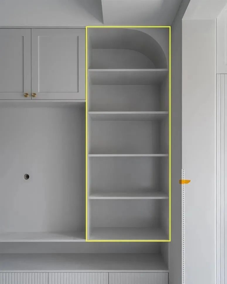 在侧面做了多层的置物架,没有装柜门,作为展示架存在,像奖杯或小摆件可以摆在上面,起到点缀装饰的效果,提升客厅装修品味。
