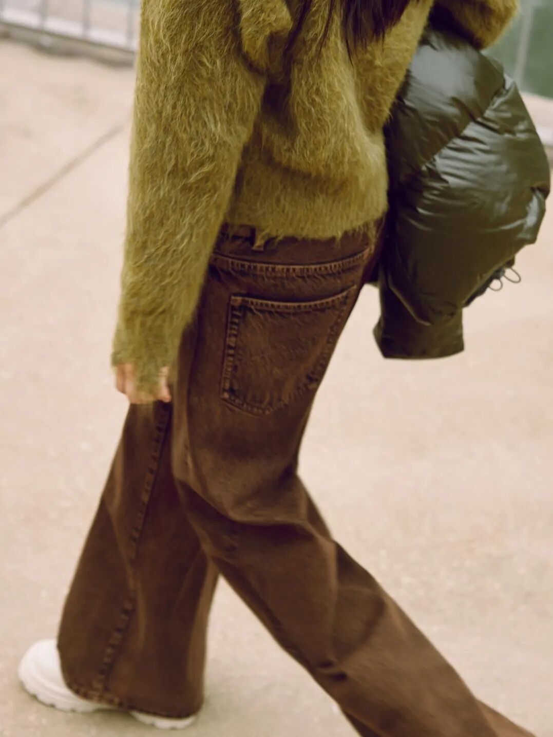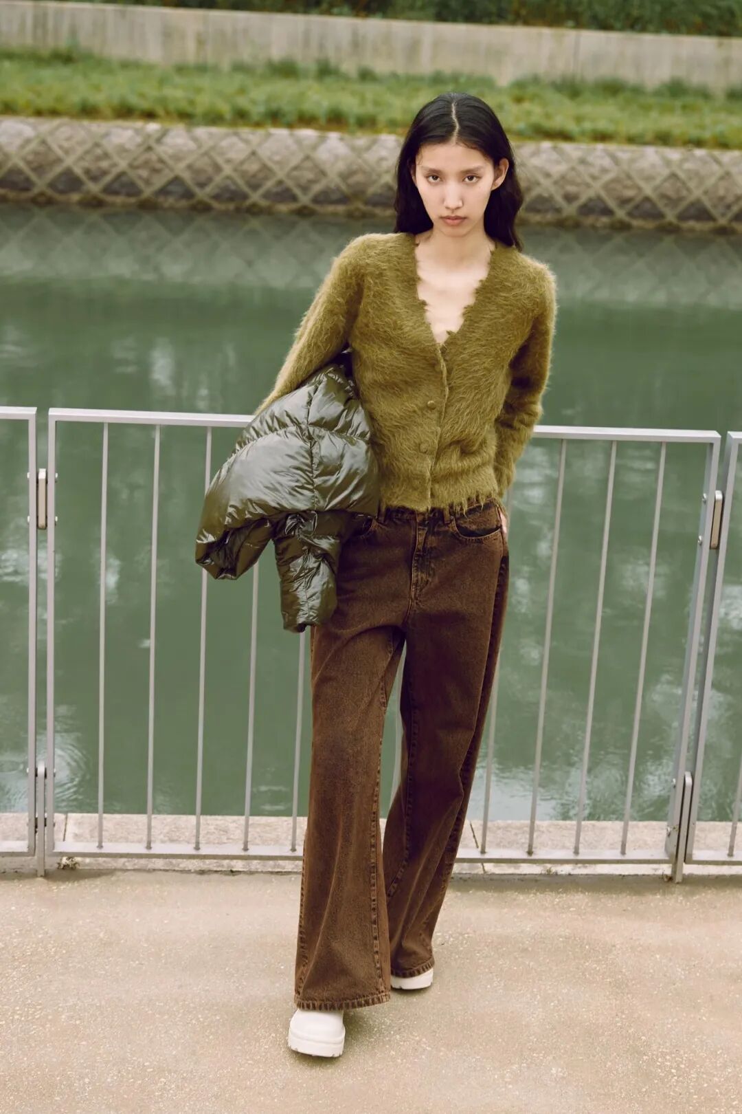 JNBY这身棕绿色系的搭配,更大程度保留了美拉德风格复古的气质,一件修身绿色毛绒开衫,搭配深棕色牛仔长裤,彰显不羁酷感。