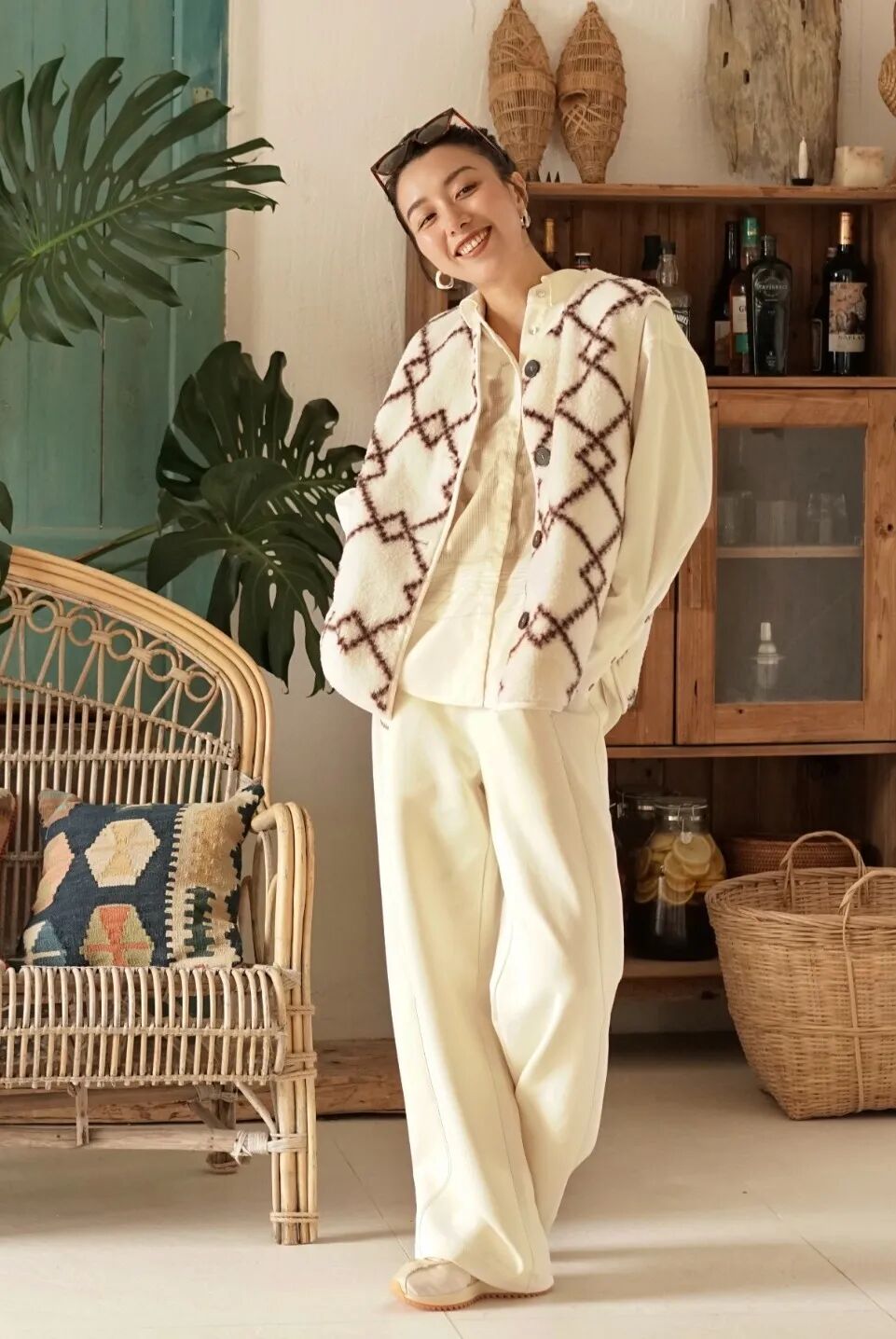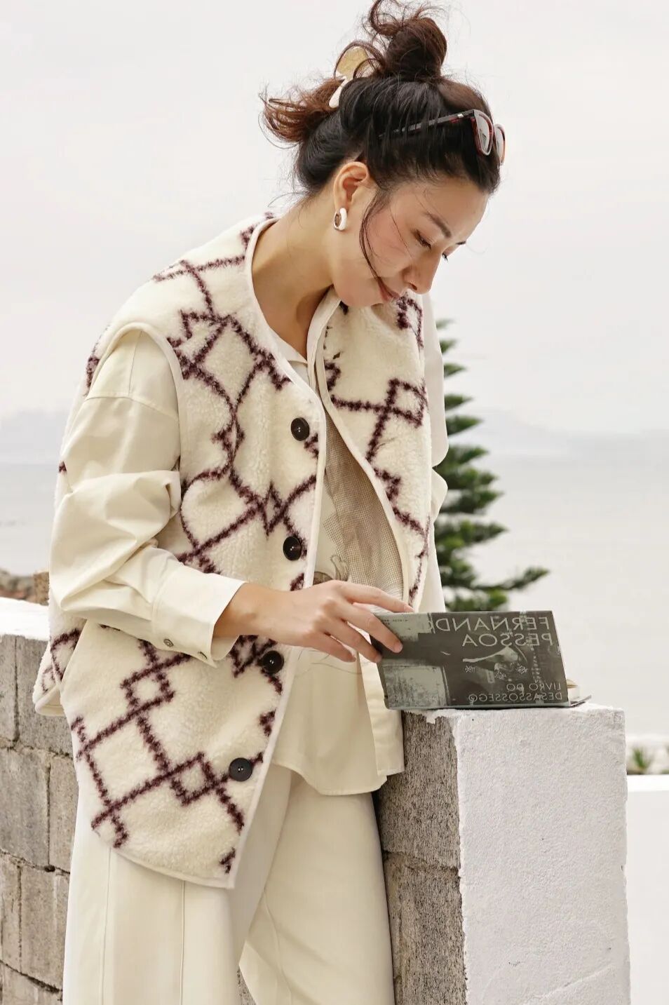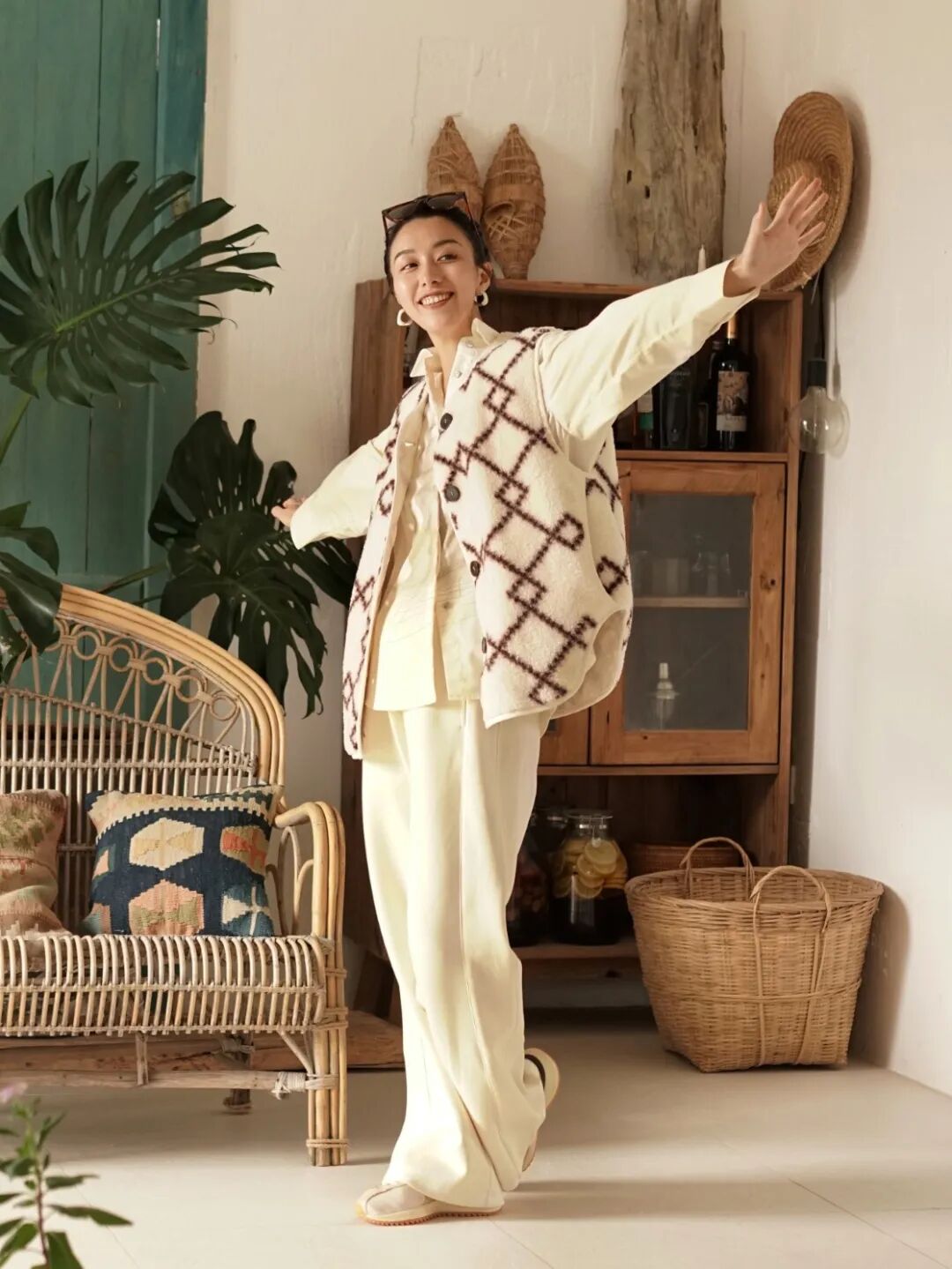 播broadcast这套搭配,质朴又儒雅的羊羔毛马甲,与印花衬衫各司其职又融为一体。浅色LOOK上棕色图形的点缀,最大程度展现10%美拉德风格的美感。