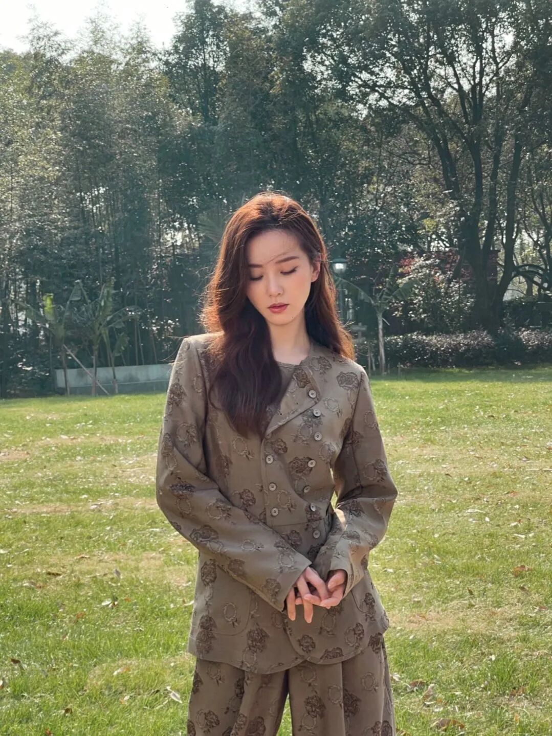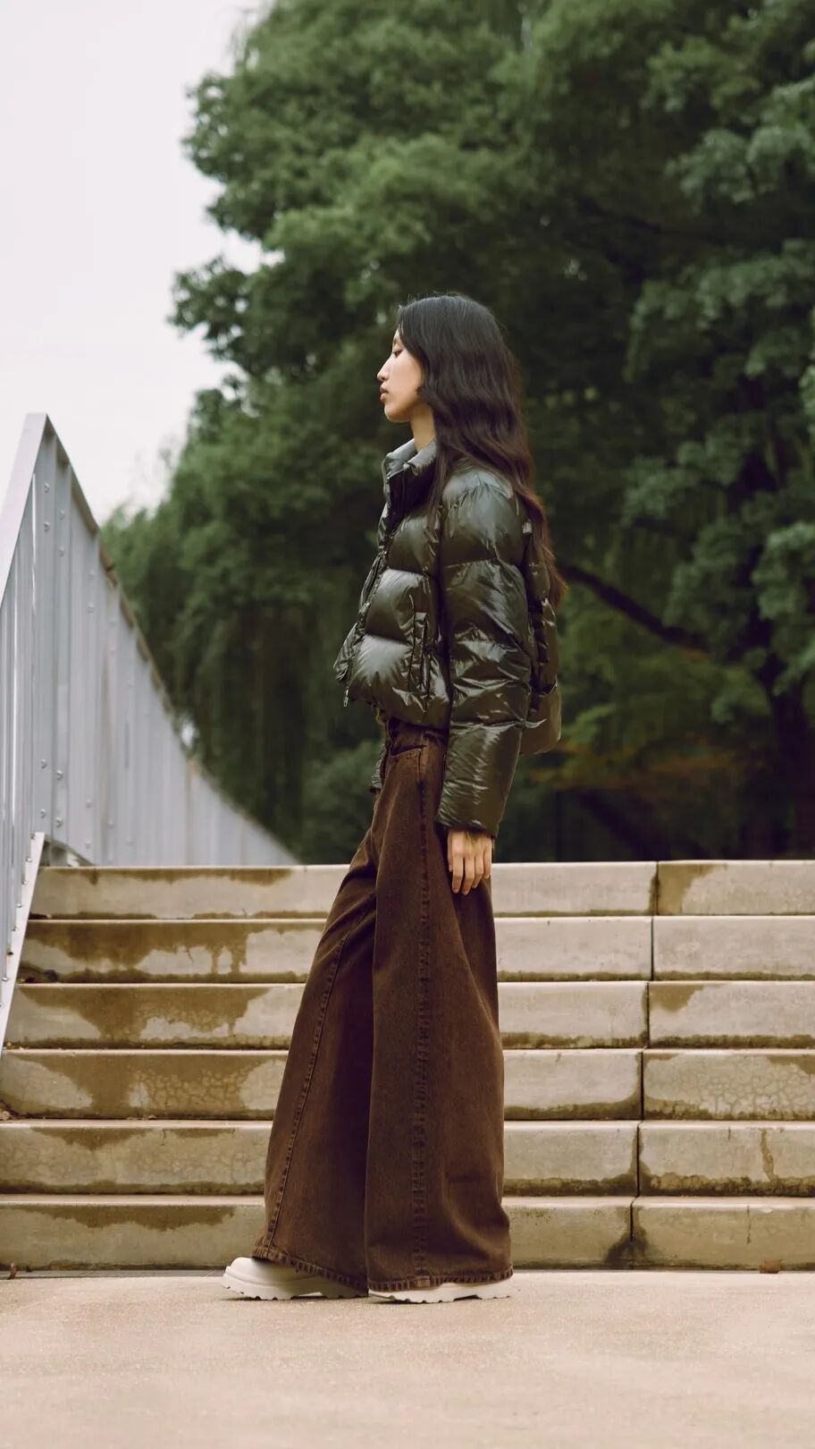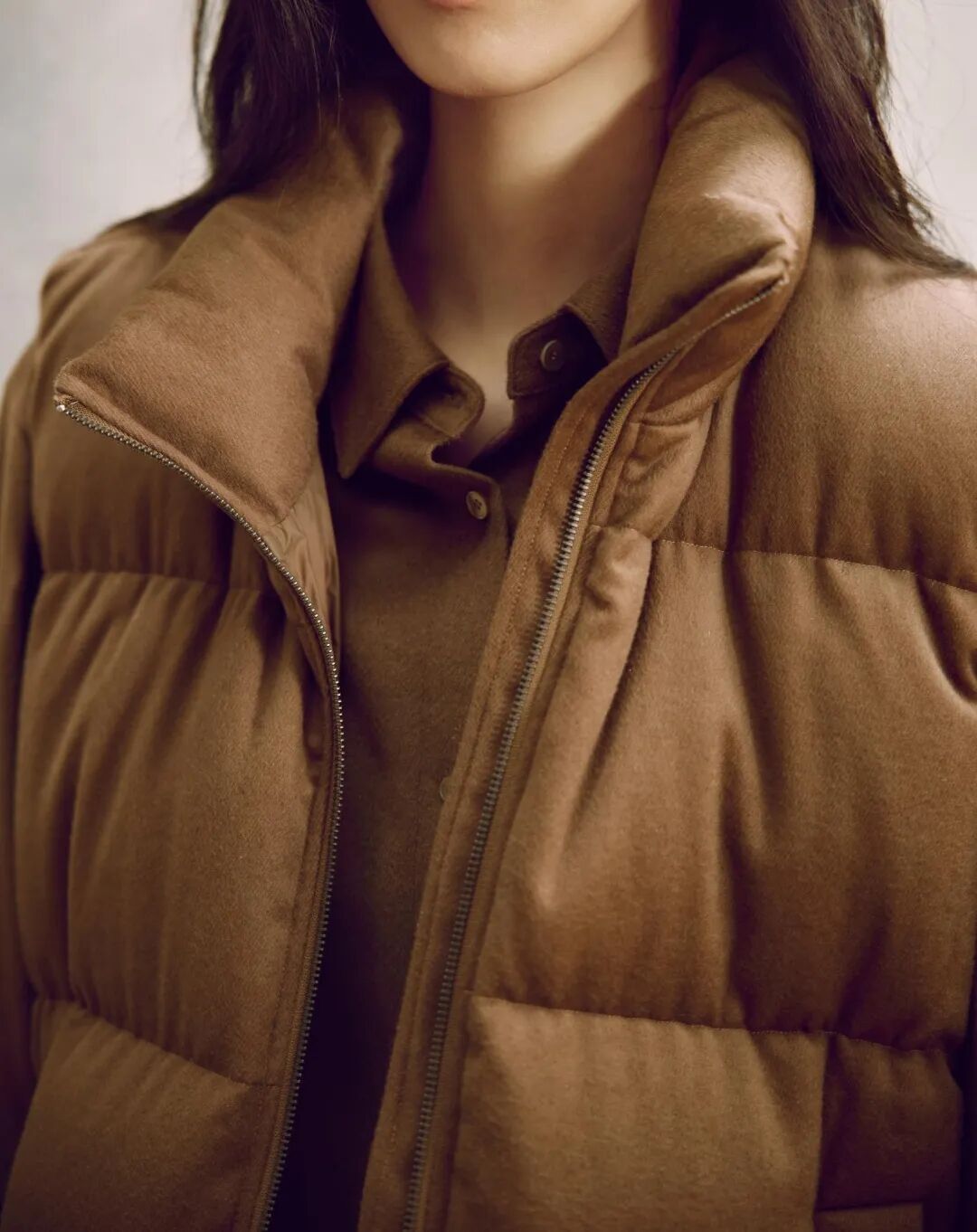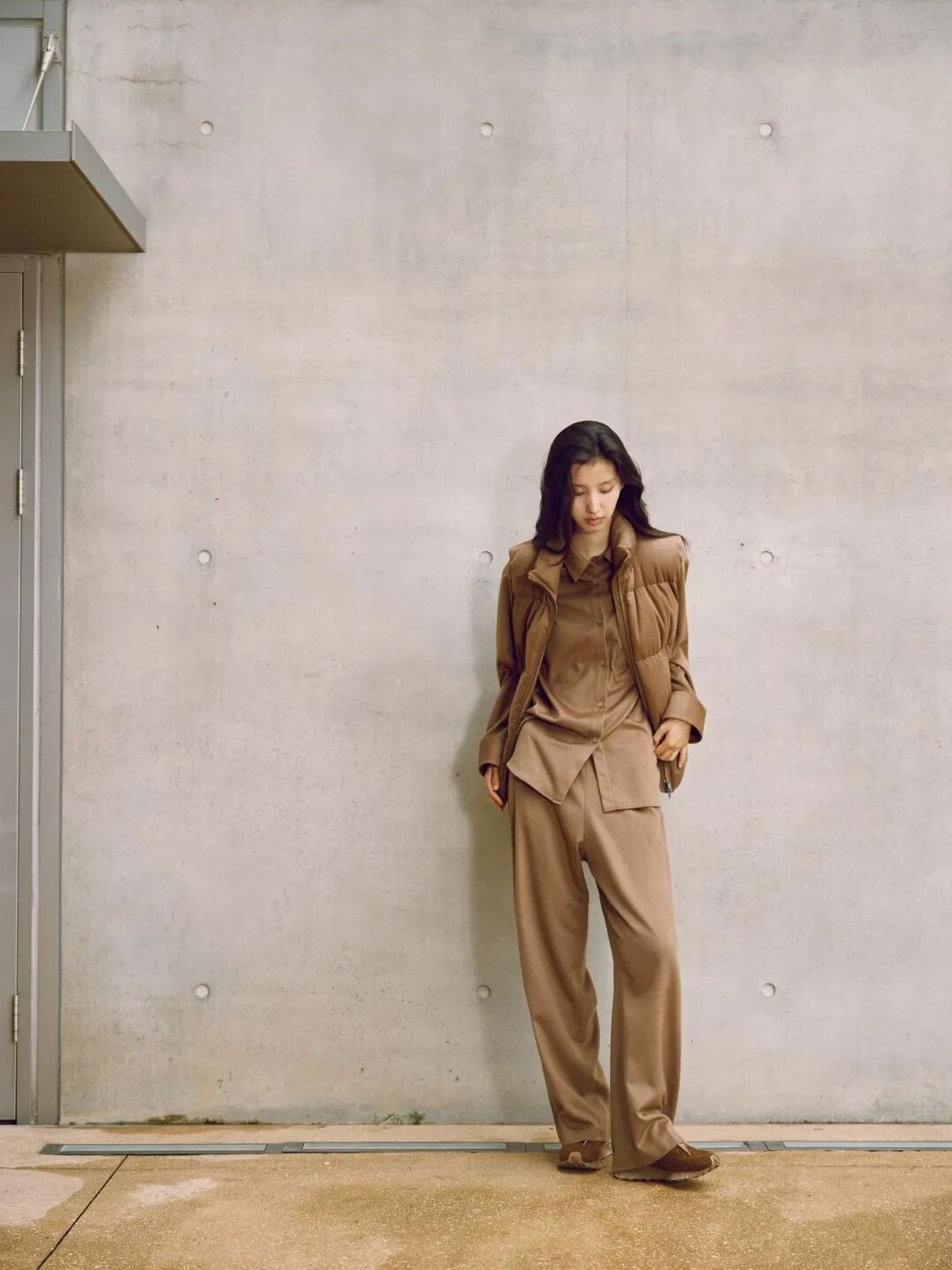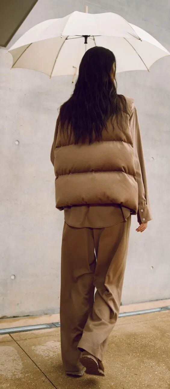 用一件JNBY的羽绒马甲搭配同色系衬衫与长裤,tone on tone的穿法让棕色调的材质和层次尽可能丰富,厚薄搭配也不会有闷感。