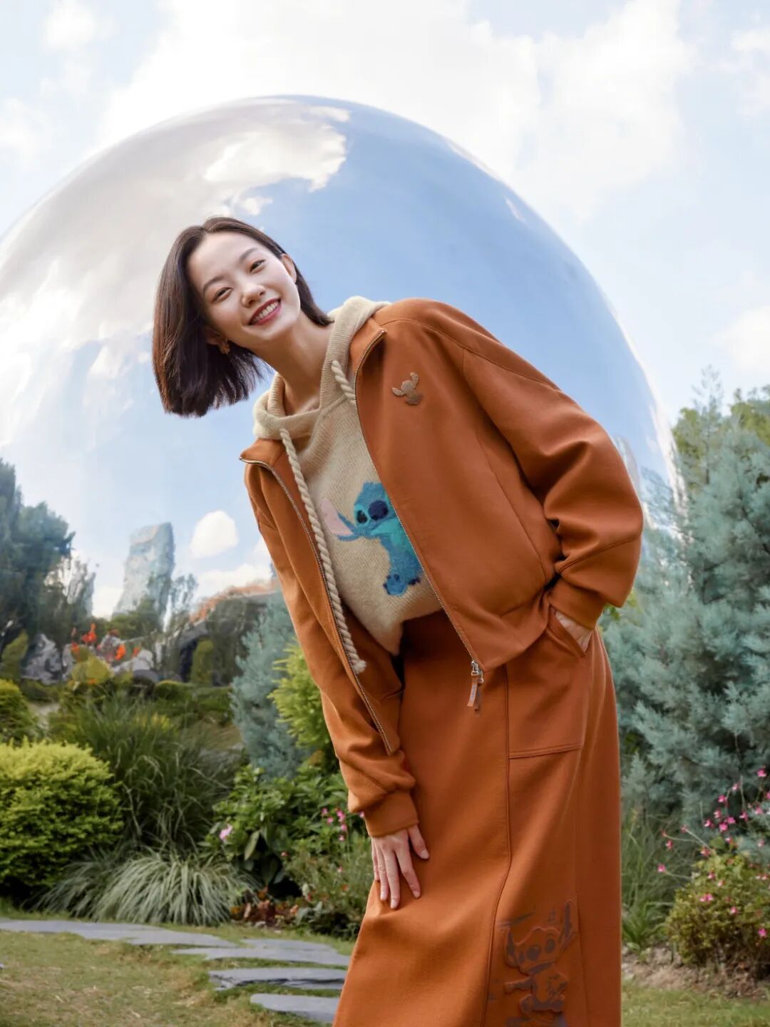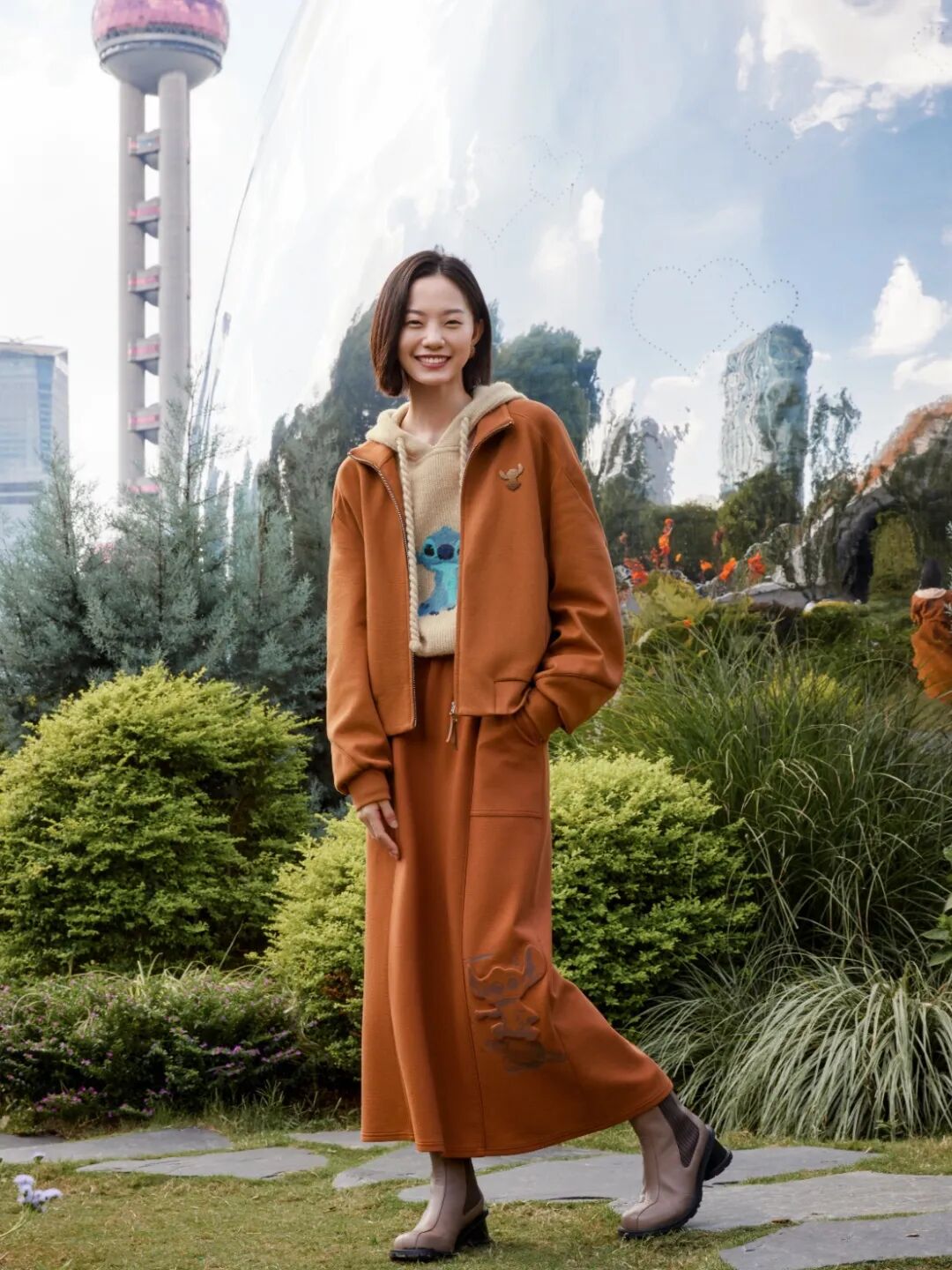 播broadcast这套是可以一键复制的心动搭配,一条橘棕色的半裙,连带肌理感印花,与同色系外套搭配,色调直白干净,穿着又十分舒适。