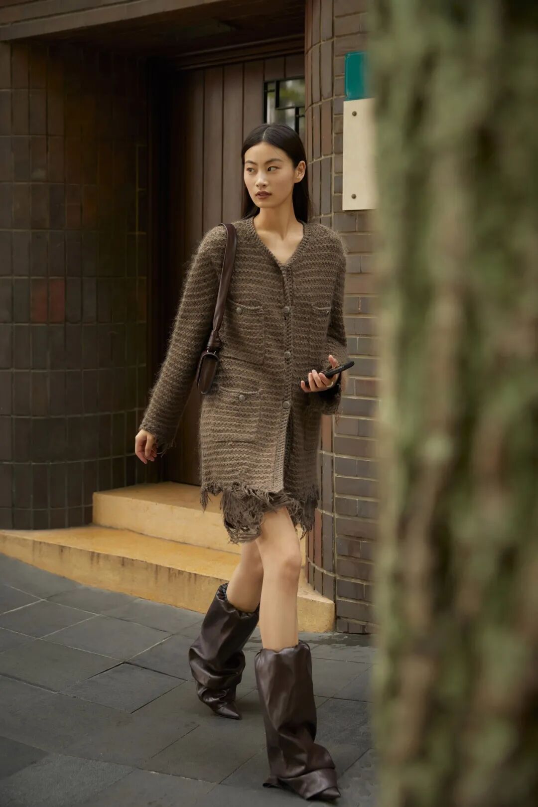 JNBY的灰棕色编制套装则很适用现在的温度,不规则毛边的加入还为整套LOOK注入随性复古感,将深秋莫名涌来的萧条感一扫而光。