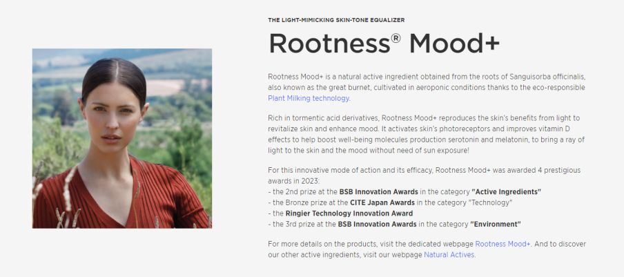 科莱恩基于地榆根提取物的Rootness Mood + 据报道含能增强情绪、并可通过减少压力来改善皮肤外观;法国科延(Laboratoires Expanscience)的山茶花籽油Epionine Bio可基于针对皮肤修复和再生中相关特定信号传导途径的分子,增强敏感皮肤屏障功能;Mibelle Biochemistry源自尼泊尔胡椒(timut pepper)的TiMood;亚什兰来自Camellia sinensis茶的Infini’tea;LipoTrue的基于黑升麻(Cimicifuga racemosa)根提取物+葡萄(Vitis Vinifera)果细胞提取物的Joybliss 和来自海洋提取发酵的Telessence Breeztel;Rahn的密罗木叶/茎提取物Myramaze-Essence。