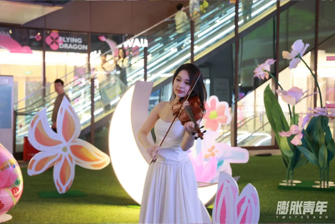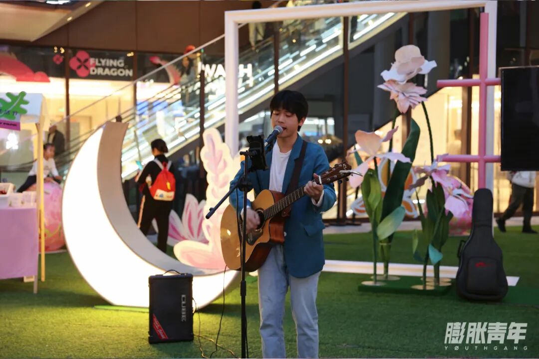 每个周三、周六的晚上六点半到七点半,十场「花」融乐貌Live派对在LG1下沉广场举办,本地知名乐队和独立音乐人们带来了吉他不插电音乐会、复古摇摆舞会等四种不同「花」样的演出形式。