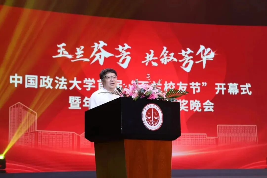 胡明为年度优秀校友颁奖,鼓励校友不断进取、奋力前行,持续发扬法大人艰苦奋斗的精神传承。