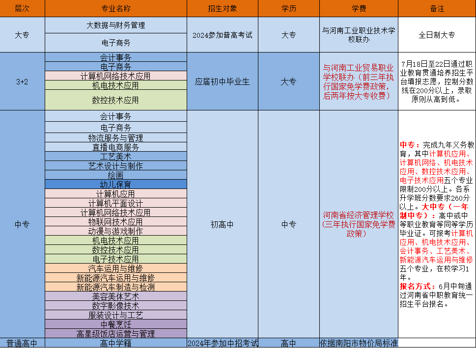 3. “3+2”大专 会计事务、电子商务、计算机网络技术、数控技术应用、机电技术应用五个专业,招收2024年参加中招考试学生,共600人。