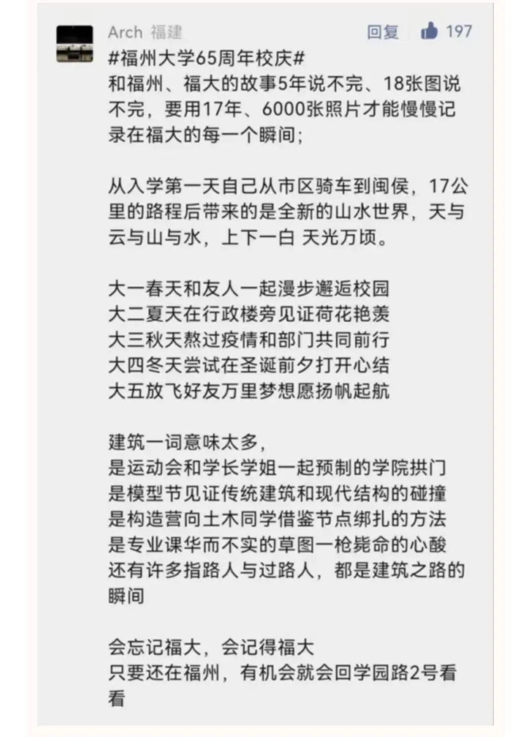 福大青年对这方土地总有别样的情愫。无形的画纸,却镌刻下了光阴的流转。那你有什么想对福大青年们说的吗?