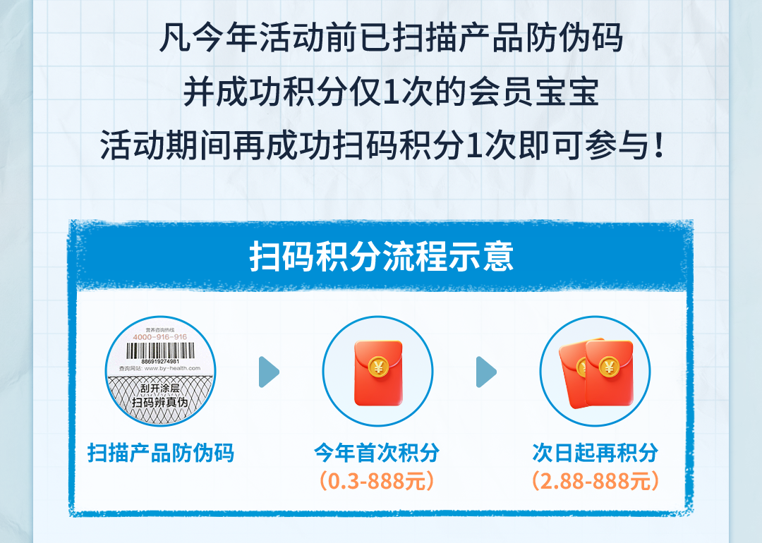 ★2024年6月12日前已扫产品防伪码成功积分仅1次的会员宝宝,活动期间内点击上方海报“开”进入活动后,按提示扫产品防伪码成功积分1次,即有机会领取2.88-888元随机金额微信现金红包1个。