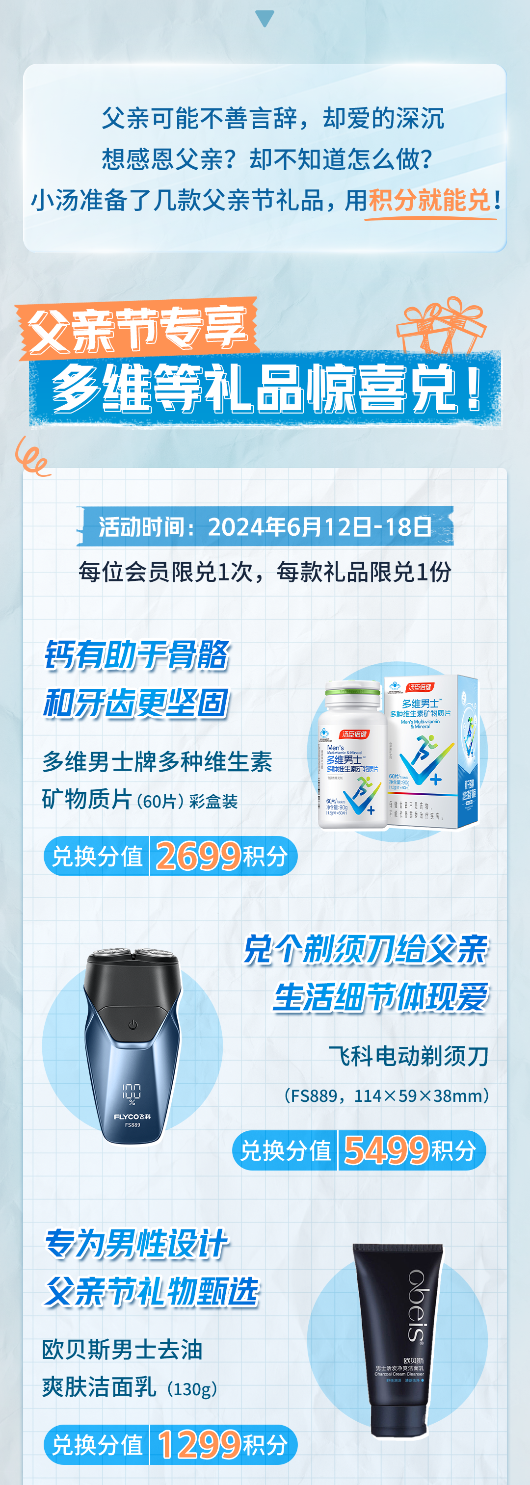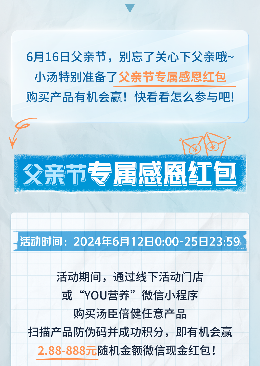 注意:红包限量5000份,数量有限,先到先得。一个手机号视为同一会员,每位会员限参与1次,活动仅限在“汤臣倍健营养家”公众号参与。如果会员宝宝今年在活动前,已通过【积分领红包】活动领取过2个微信红包,则无法参与“父亲节专属感恩红包”活动。