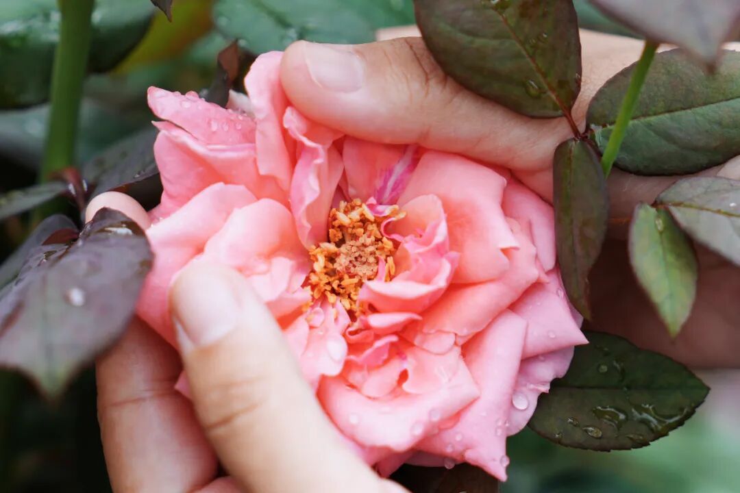 记者触摸一朵月季花,感受花瓣的柔软触感。