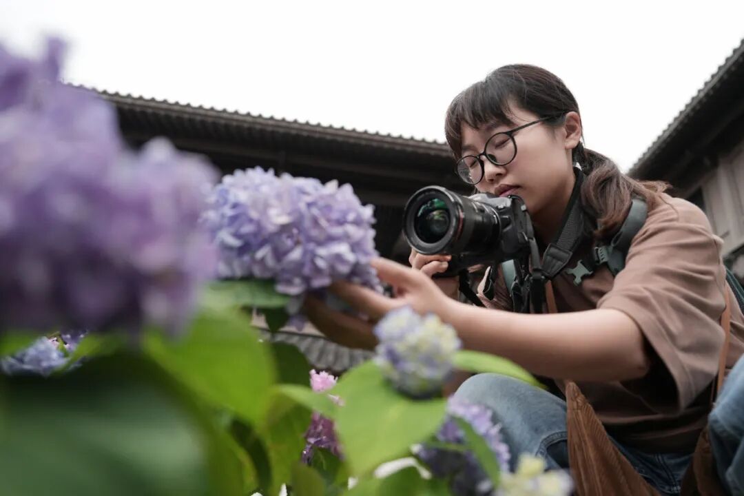 4月29日,本报记者陈忧子闭上双眼,用手触摸绣球花,体验在黑暗中拍摄。