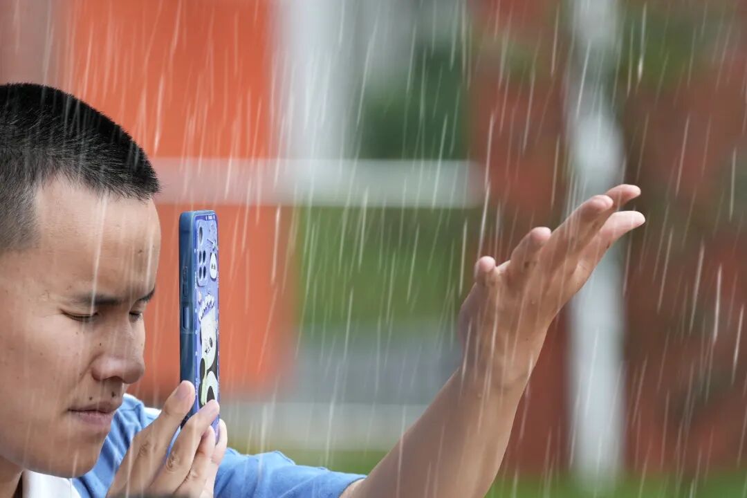 康金塬在“触摸”天气,并用手机记录下雨的瞬间。