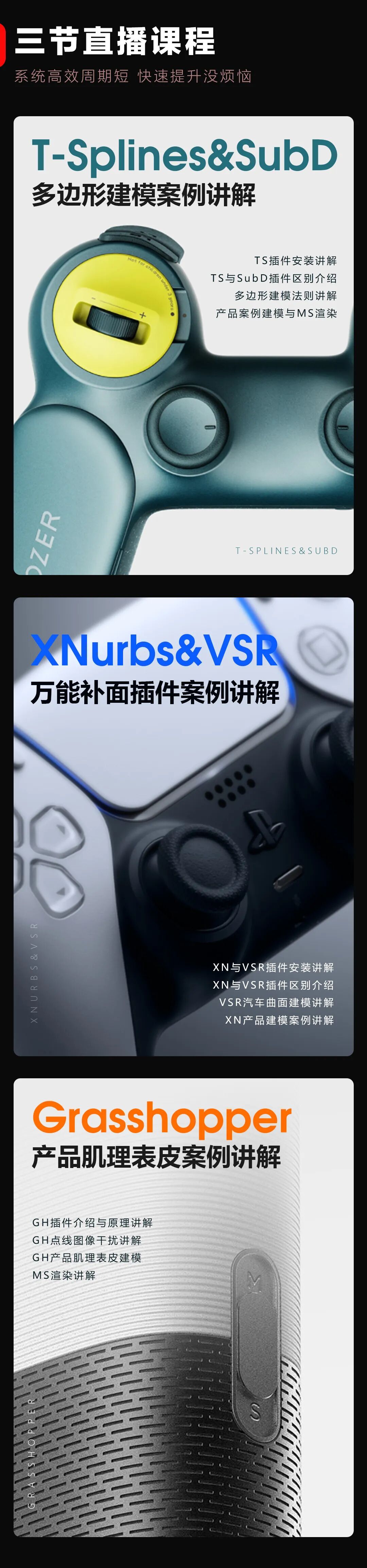 5月27日-5月29日,通过三个不同的产品建模案例讲解,掌握TS4、SubD、XNurbs5.1、VSR、GH等必学建模插件,让学员能自由应对各类复杂造型建模。