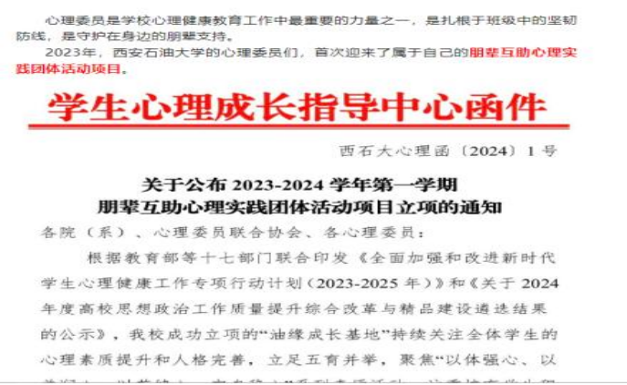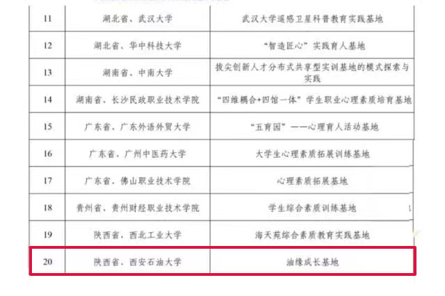 近日,教育部公布了2024年度高校思想政治工作质量提升综合改革与精品建设项目遴选结果,我校申报的“油缘成长基地”入选2024年度学生综合素质训练基地,建设经费50万元(全国仅20所高校)。
