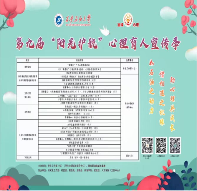 依托“阳光护航”心理育人宣传季、”5•25心理健康节”“10•10世界精神卫生日”等心理健康宣传节点,融入五育理念,基地广泛开展贴近学生需求、形式多样、特色鲜明的30余项“油缘”心理健康教育宣传活动。