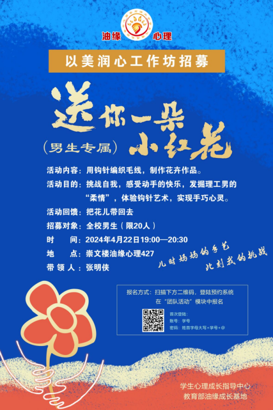 中心专职教师特别开设了五育融合工作坊:“活着--生命意义探索工作坊”“大学生逆商训练工作坊”“一起ACT,让心理更灵活,让生活更美好--心理委员赋能减压工作坊”“在关系中疗愈--萨提亚式团体沙盘工作坊”“在自我探索中疗愈--团体沙盘工作坊”。