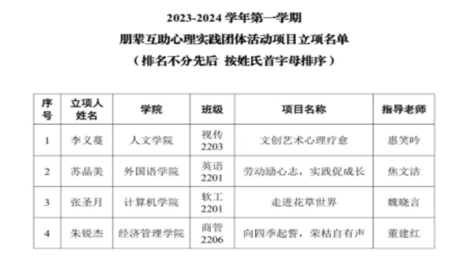 学生围绕五育主题申报由心理中心组织的“朋辈互助心理实践团体活动”项目,班级心理委员和心理学爱好者担任项目主持人,组织同好参与活动,提升学生朋辈互助能力,拓宽第二课堂实践空间。